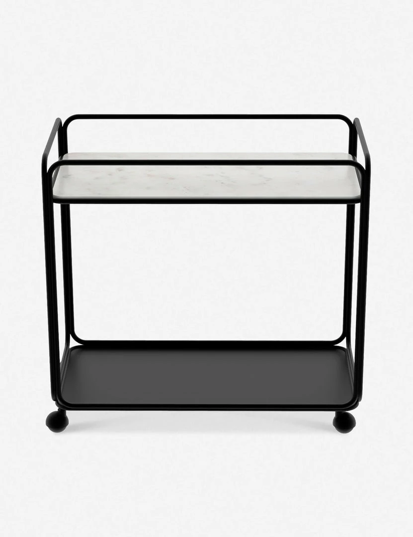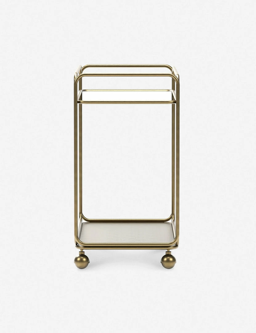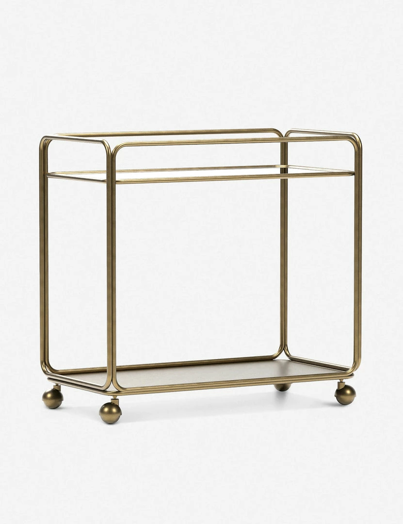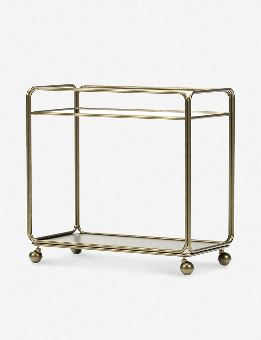 A bar cart made for bringing a refined style to your small space look. The steel tube frame sits on ball casters casting an airy, modern silhouette perfect for a curated design moment or dynamic appeal when entertaining.