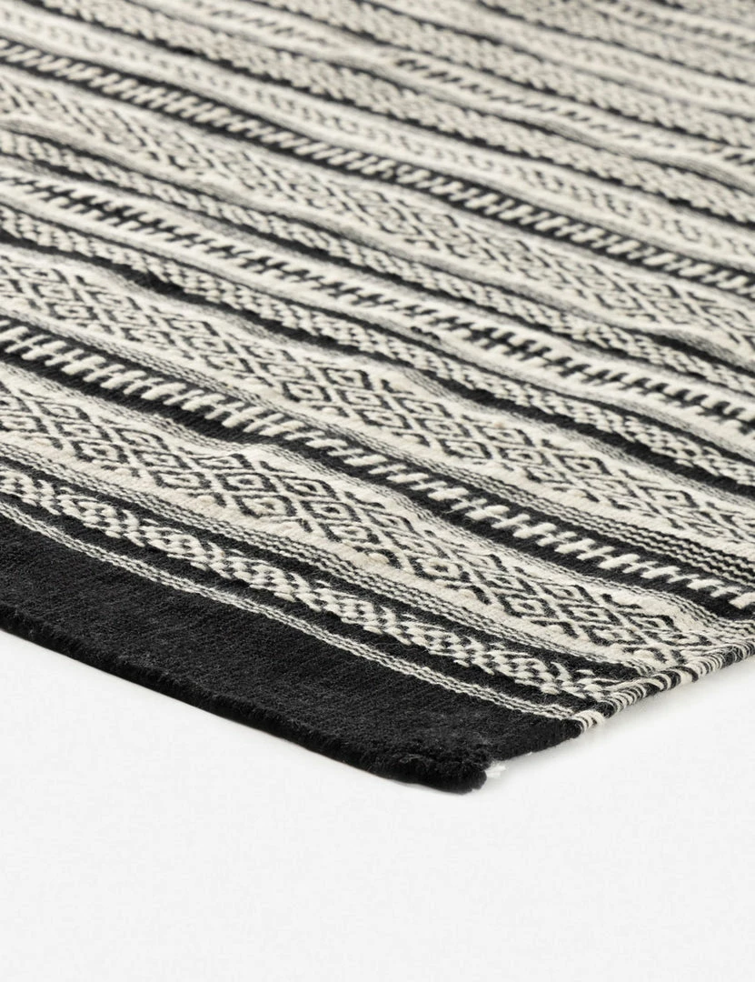Timeless and chic, this black-and-white rug strikes an appealing contrast with an eye-catching blend of patterns and tone. The hand-loomed floor rug is made from recycled materials for a durable, easy-care construction. Anchor a patio lounge or layer in for a soft yet durable floor rug in a high-traffic interior space.
