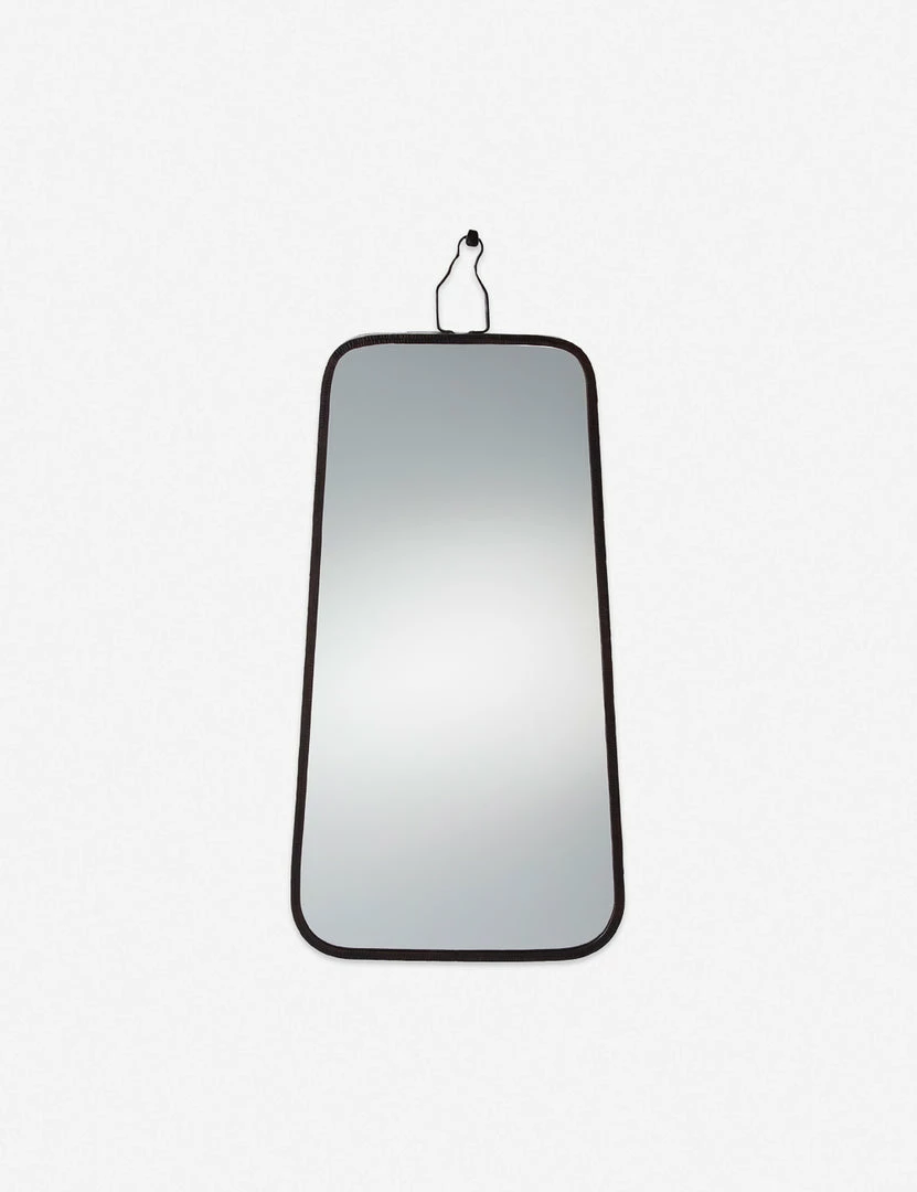 A striking design by Barry Dixon features a textural iron frame with a decorative spike to give the illusion of a rustic hanging mirror. Mount this unique framed mirror for an industrial look that folds perfectly into a moody aesthetic.