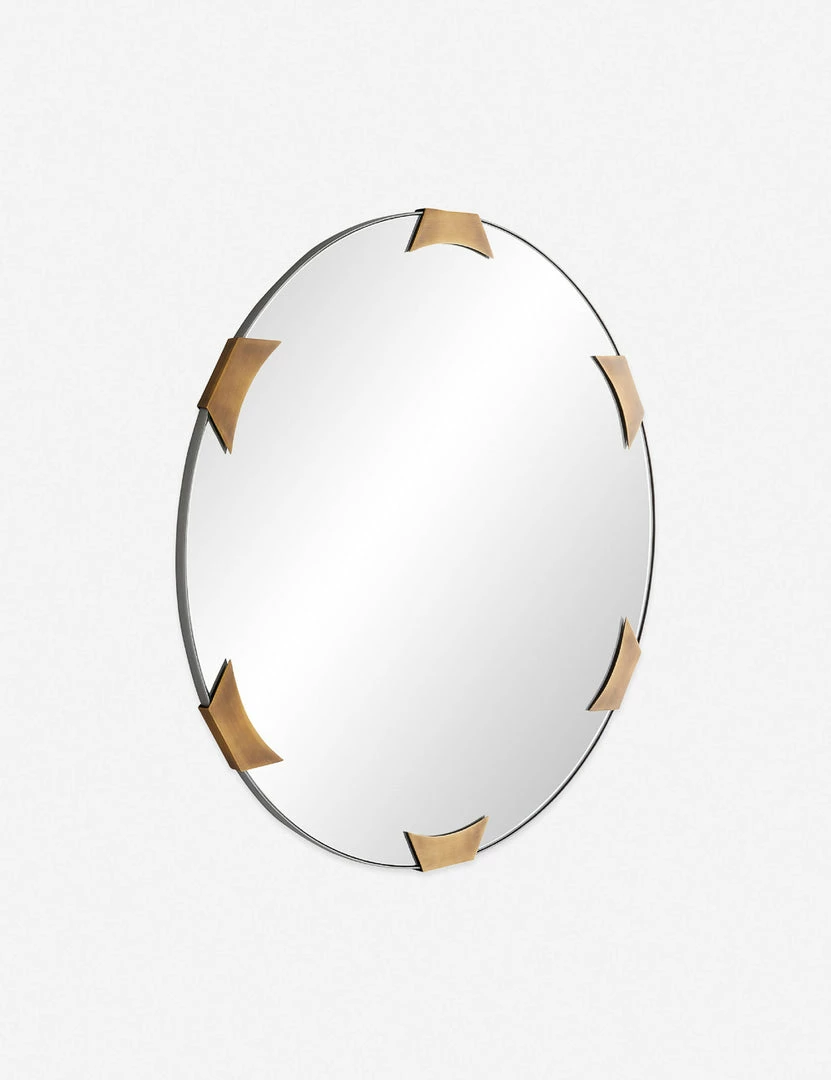 Transitional design gets a modern edge in this wall mirror. The blackened iron frame is fitted with antique brass clasps for a dramatic flair. Style this round mirror for an effortless touch of sophistication.