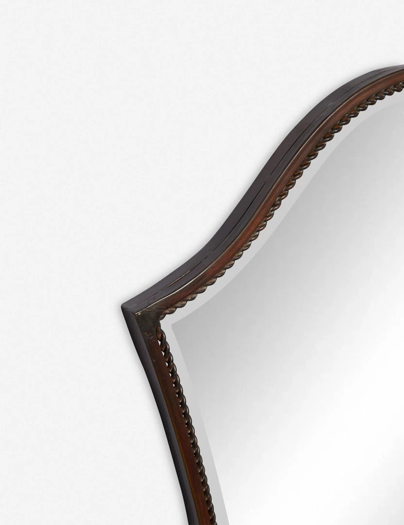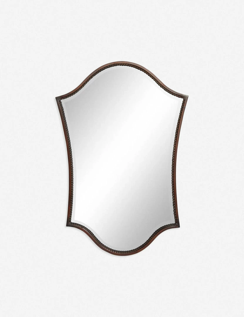 A dramatic silhouette, border detailing, and an antiqued finish bring a touch of whimsy to this shaped mirror. Style this decorative mirror for a chic, functional addition to a bedroom or entryway.