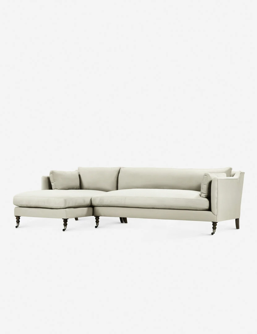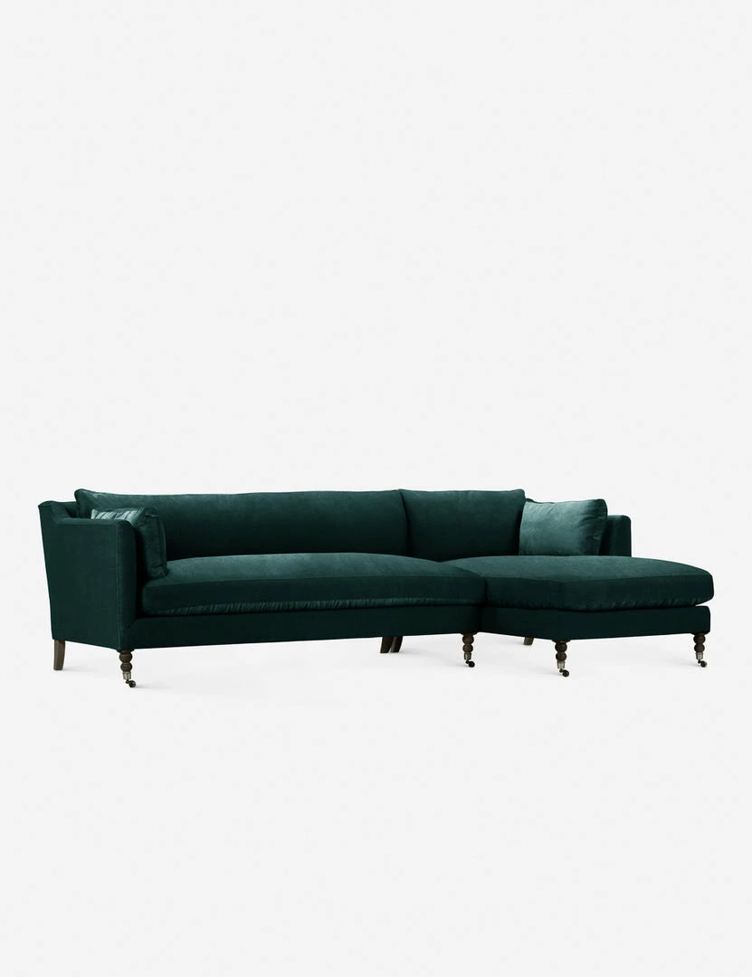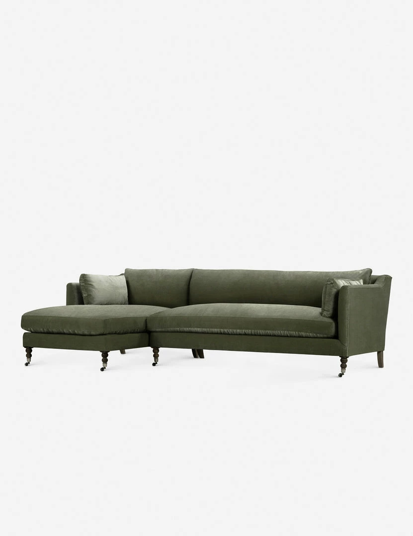 Add a touch of vintage flair to your living room or office with the Fabienne Sectional Sofa. Antique styling pairs traditional curved legs in the back with ornate turned legs in the front. This velvet sectional with a chaise is finished with small front wheels to ease movement.