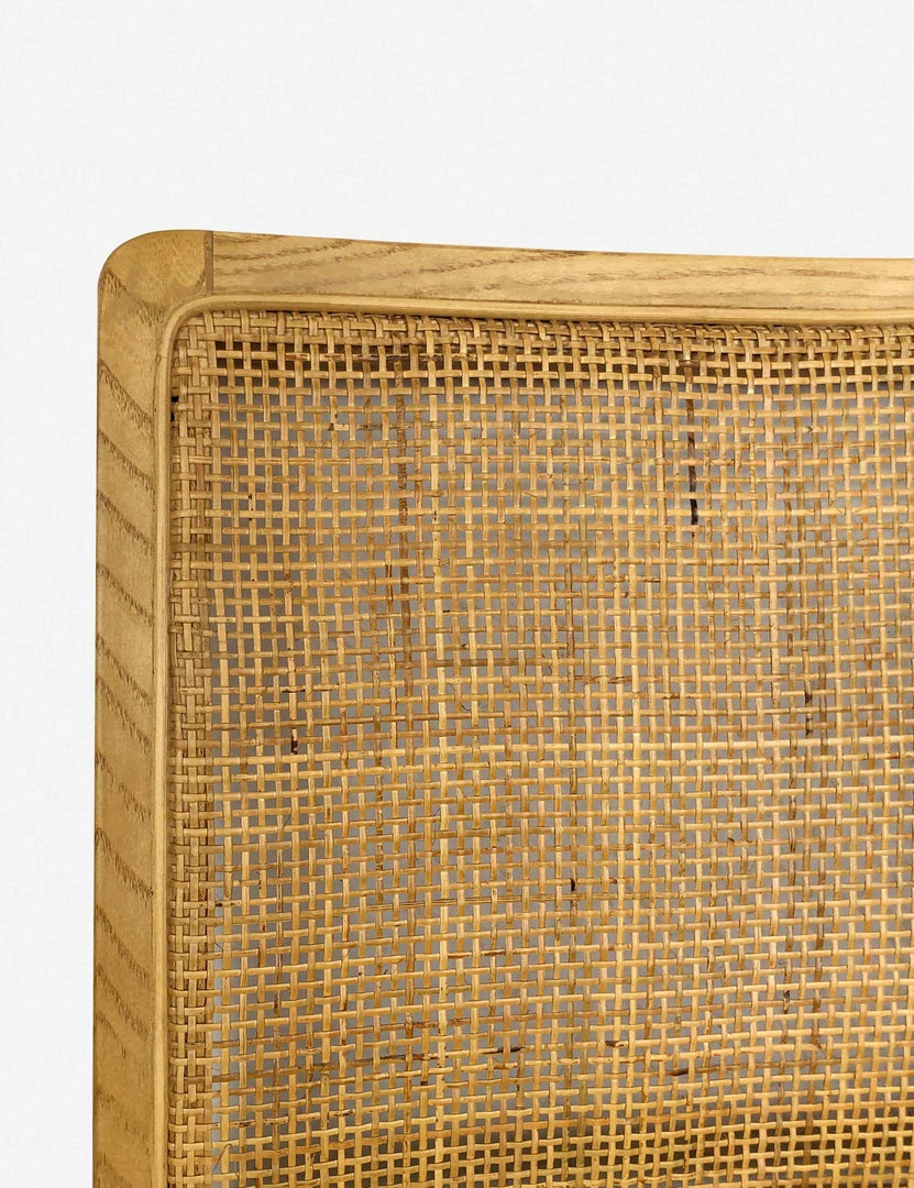 This elegant dining chair features timeless details and warm natural tones. Its solid elm frame is finished with a woven rattan back and upholstered seat to offer a refined accent layered with organic textures. Style this dining room chair in a clean, light-filled space.