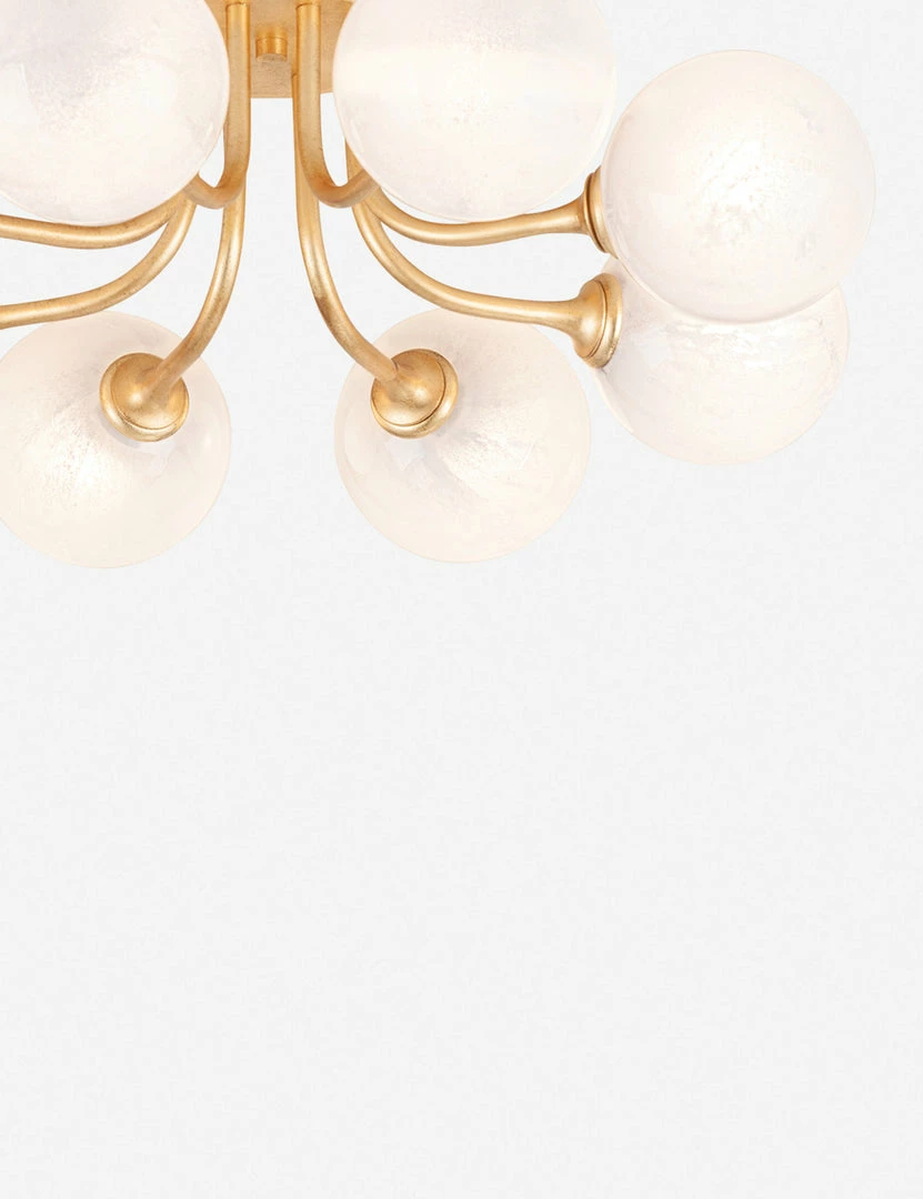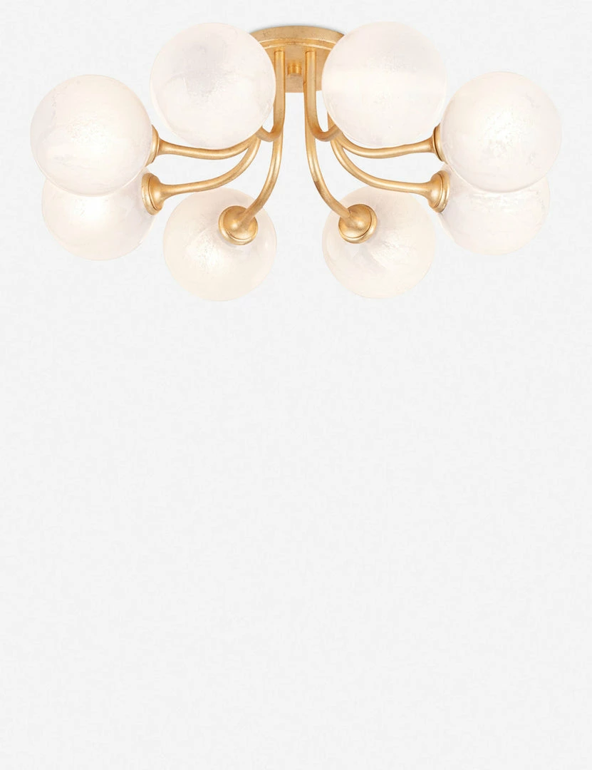 A frosted orb and gold leaf finish offer a touch of brilliance to the graceful lines of this overhead light fixture. The semi-flush mount lighting design is ideal for a grand statement in a luxe apartment or enclosed dining space.