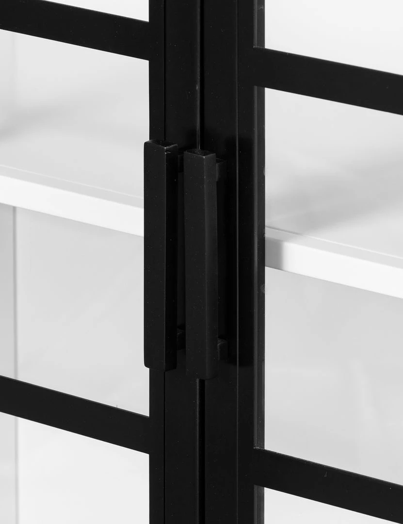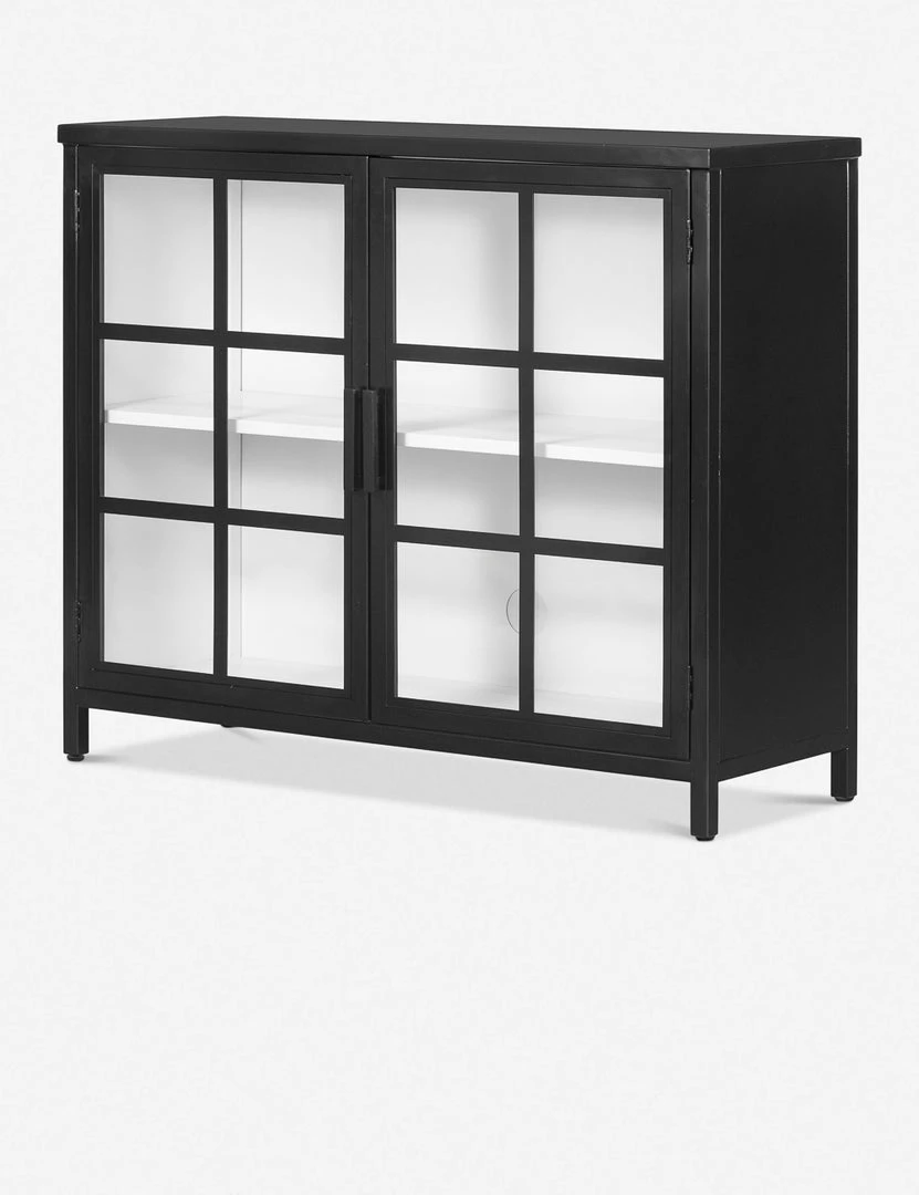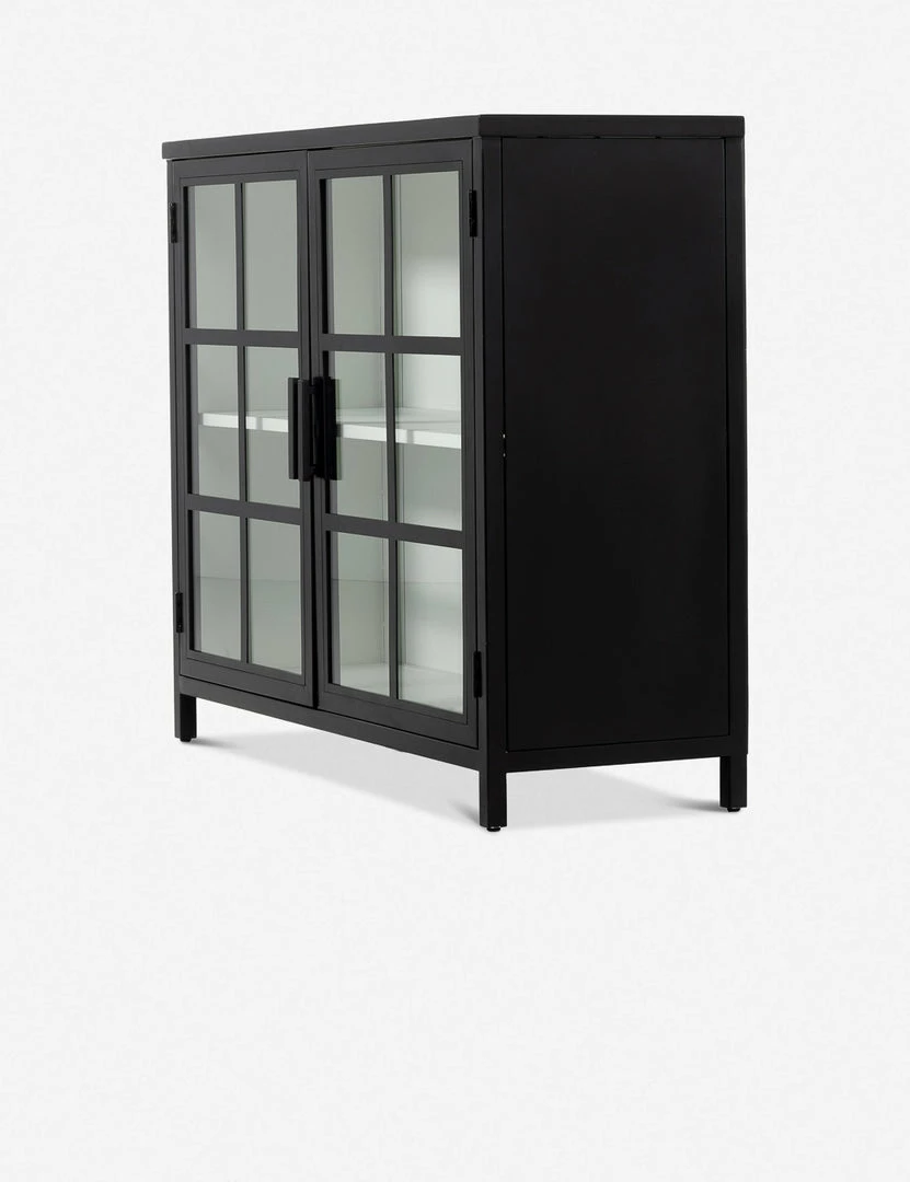Vintage European design offers timeless style. Windowpane glass doors and a sleek black finish make this small curio cabinet a unique storage solution for home offices and small-space dining rooms.