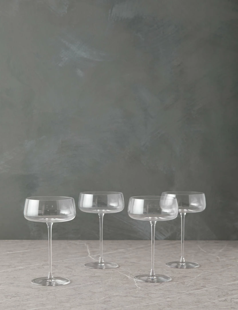 Angular silhouettes and rounded details add sophistication with a modern edge to this versatile glassware collection. A refined take on the classic coupe, this set of champagne saucers is the perfect touch for sparkling drinks to craft cocktails.
