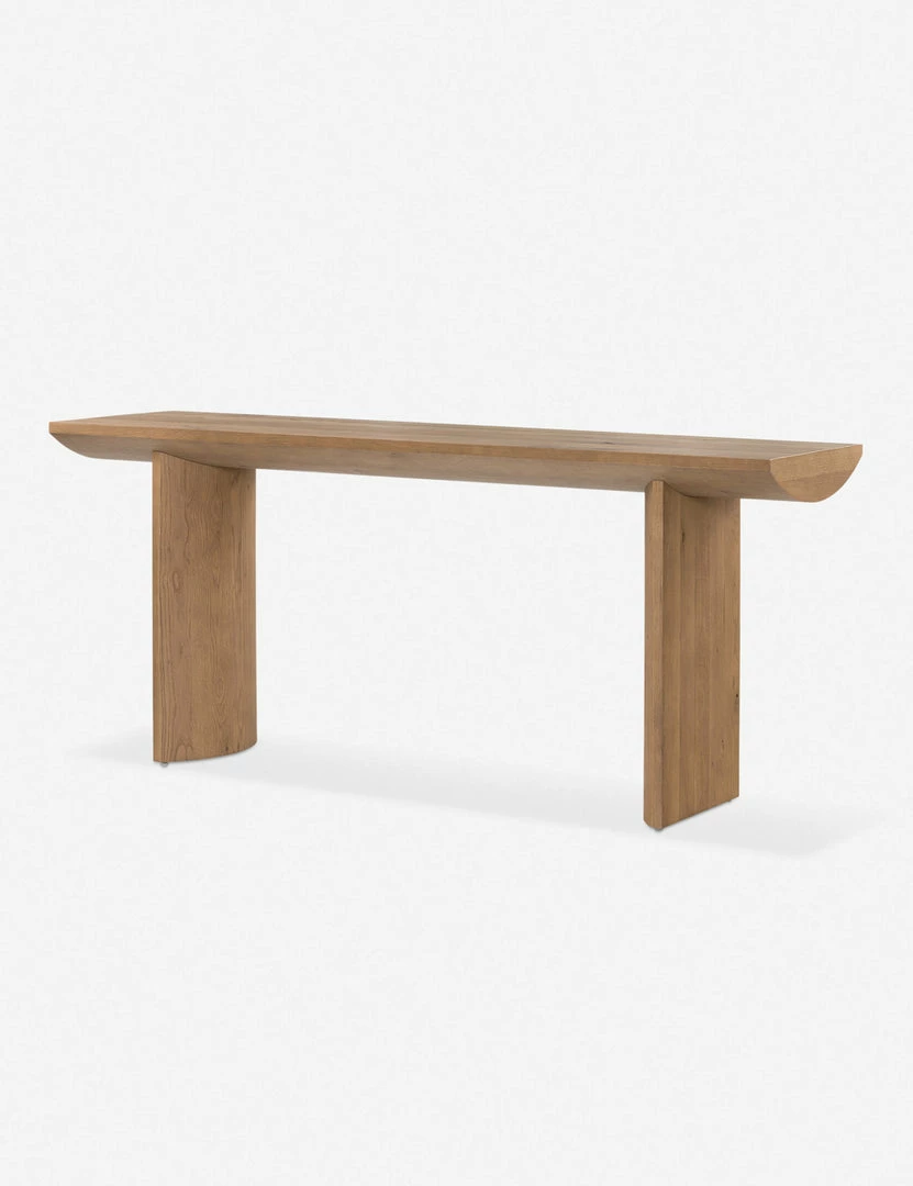 Casting a clean, cut silhouette, this wood console table design is softened by a curved-bottom tabletop sturdily set on two flat, solid legs. Clad in a beautiful oak veneer for natural grain appeal, this hallway table can add a polished touch with organic warmth to your entryway or living space.