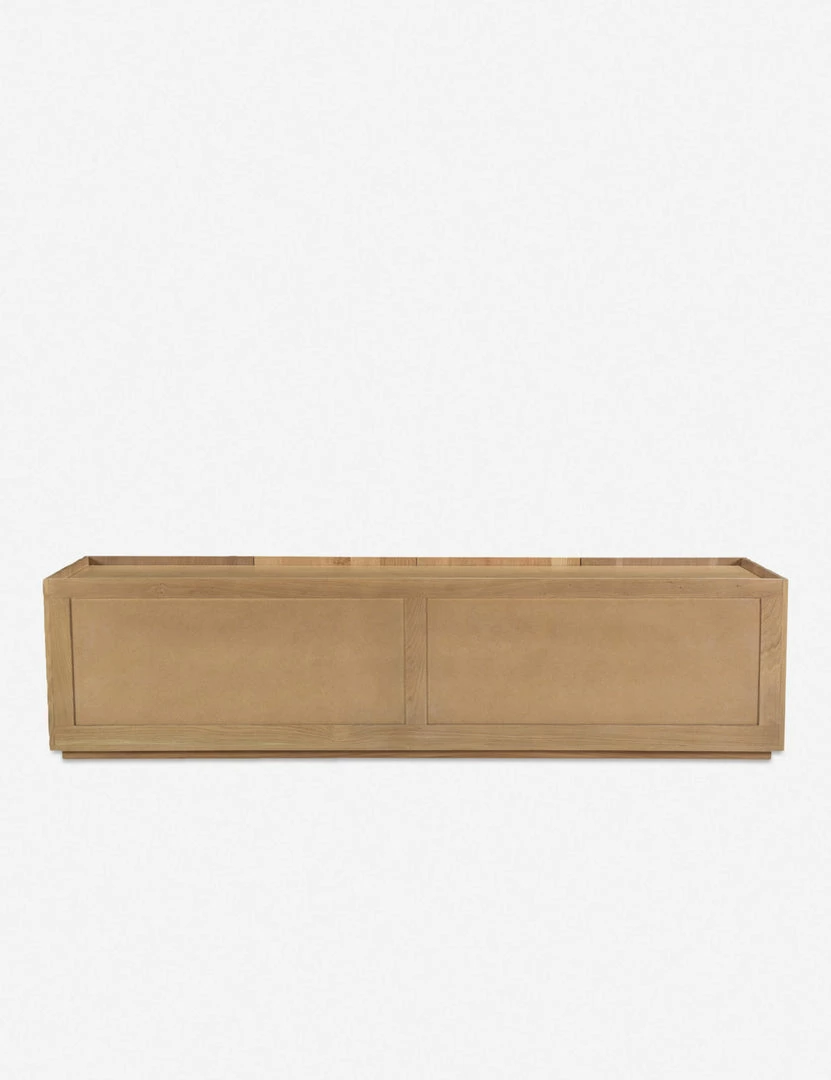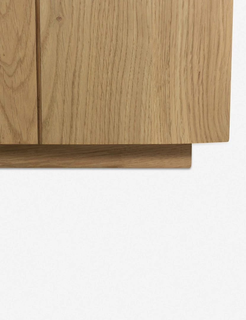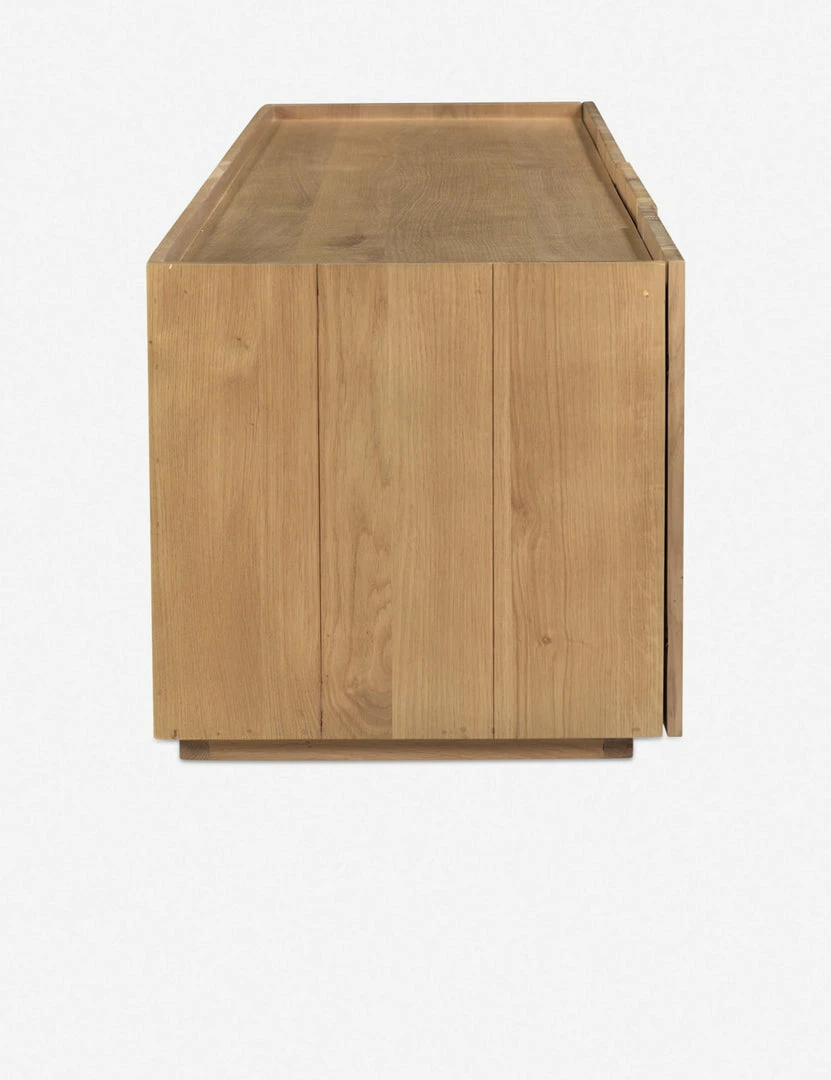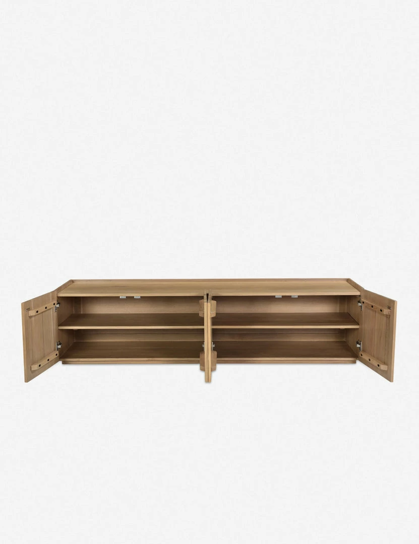 Fashioned from solid oak planks, this media console is versatile, refined, and grounded in natural grain appeal. With cabinet doors opening to spacious interior shelving, this wood console offers ample storage in a crisp design. The low-slung design brings a balanced touch of organic minimalism, perfect for a family room or casual lounge.