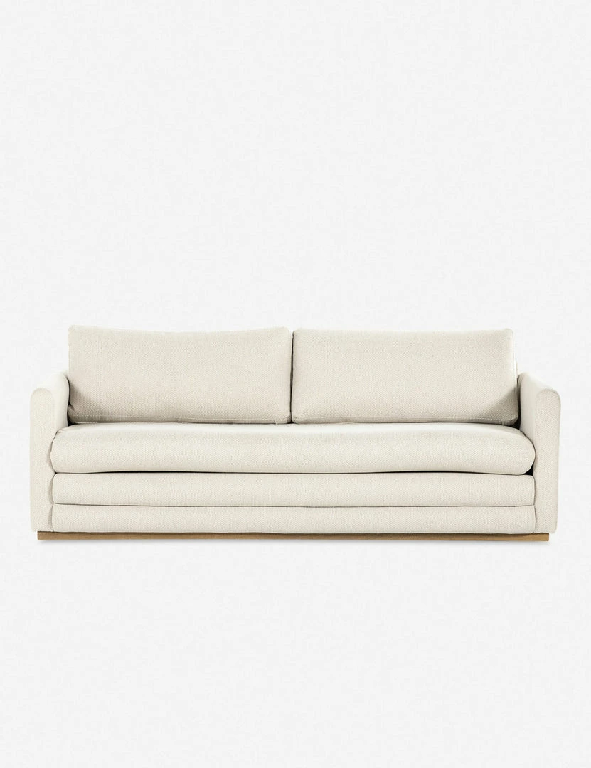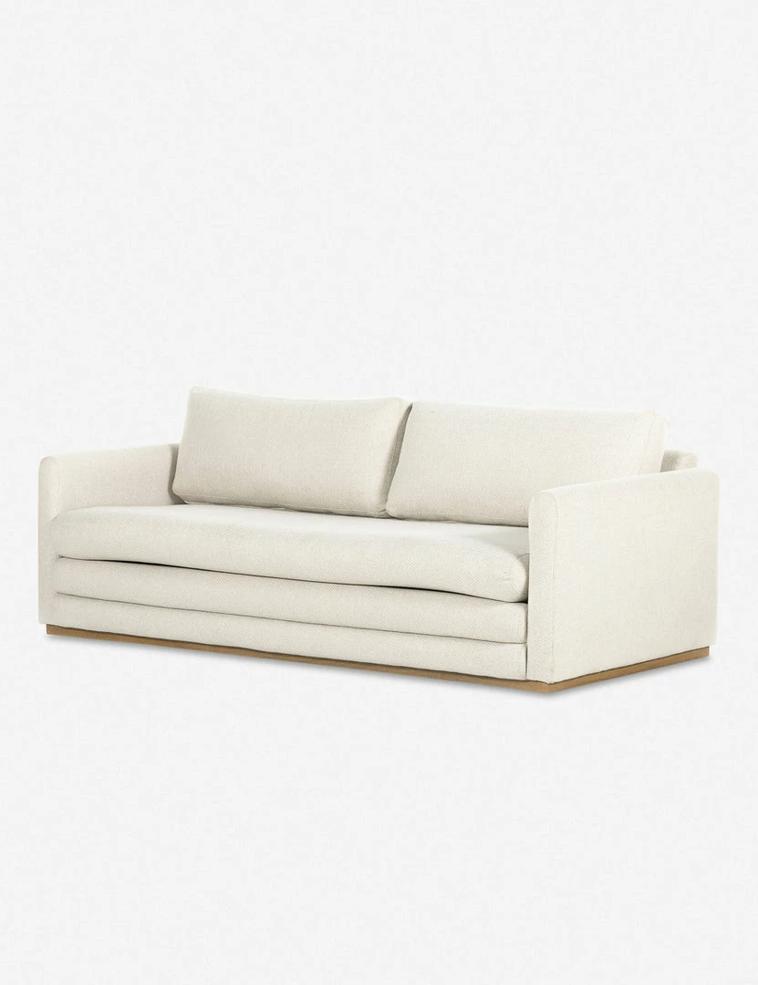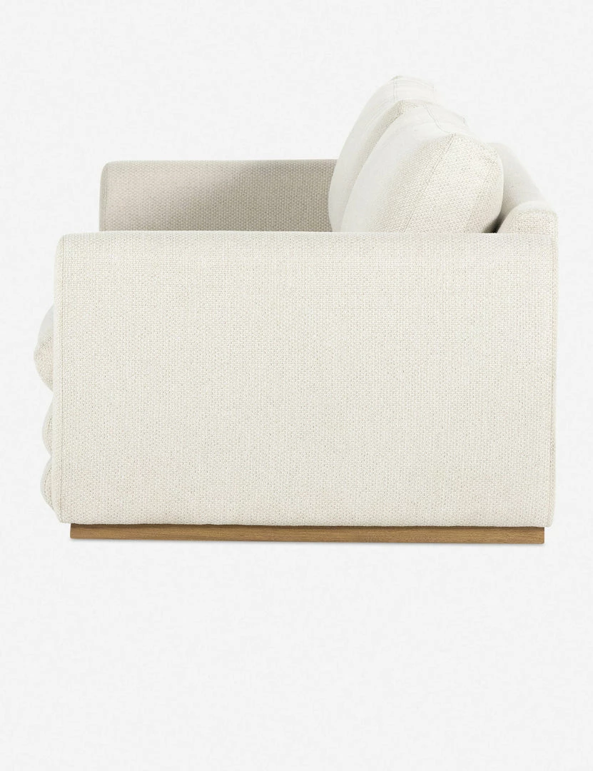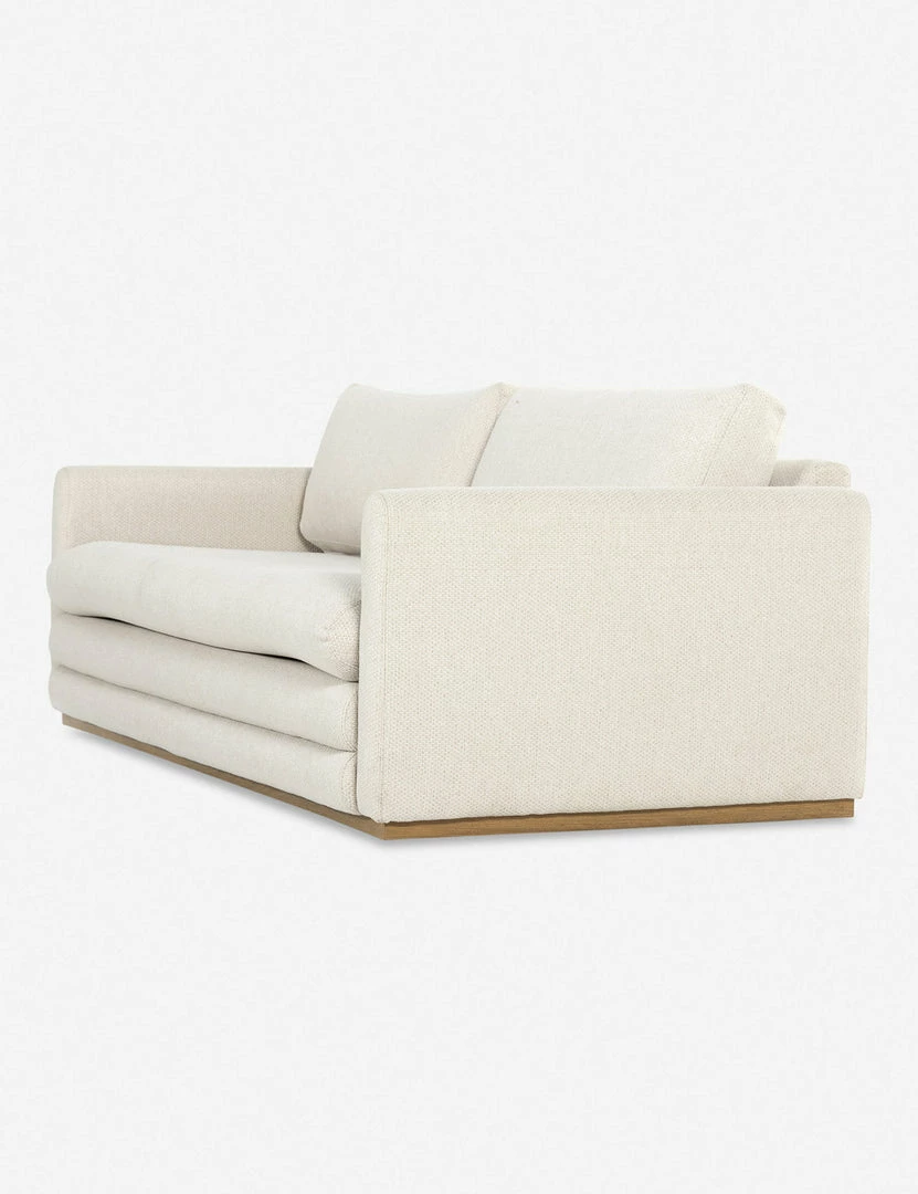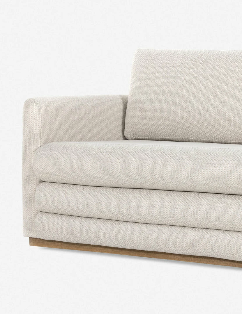 Channel tufting along the base creates a plush couch design piled high in lounge appeal. Soft lines and a plinth base give this inviting sofa a chic air that can style from cozy modern to graceful and refined.