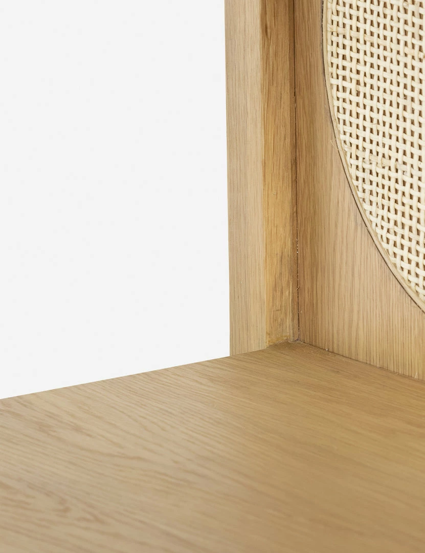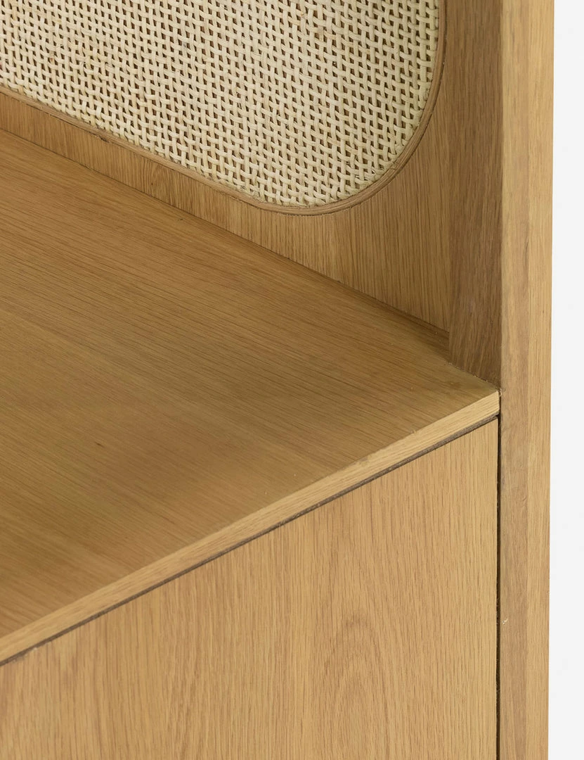 Honey-finished oak and oval-shaped cane paneling inspire transitional appeal in the Verna Bookcase. With a spacious lower drawer and clean, streamlined frame, this bookcase offers effortless warmth with plenty of room for storage and display.
