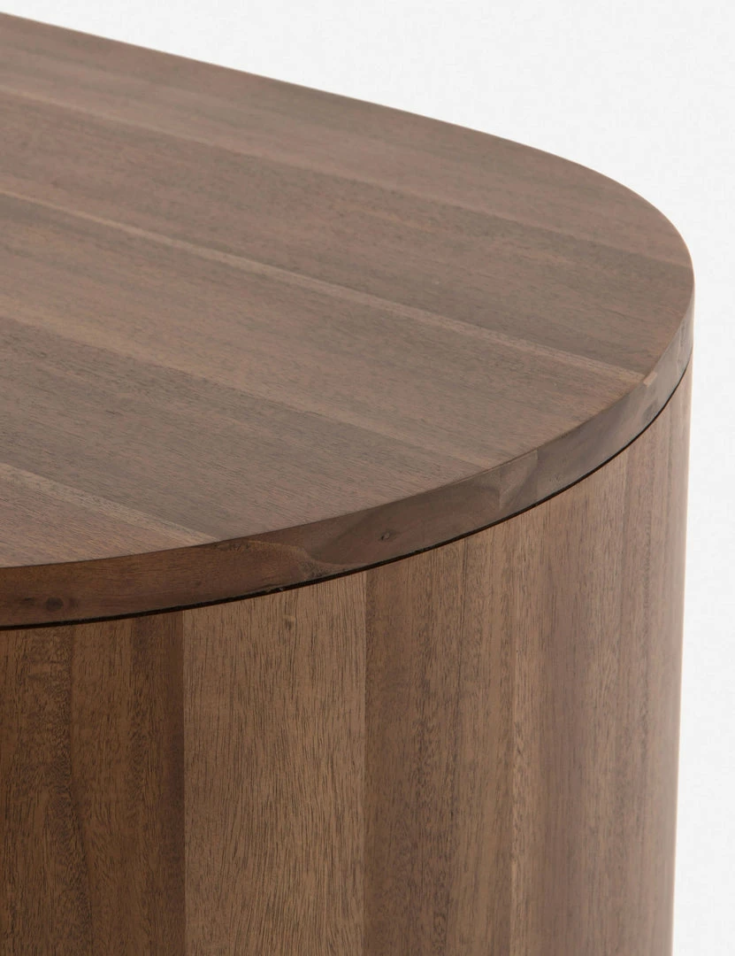 This pill-shaped wooden desk brings a stately look with a slightly retro feel to your office. The simple silhouette features hidden storage shelves in the half-cylinder legs and two convenient drawers.