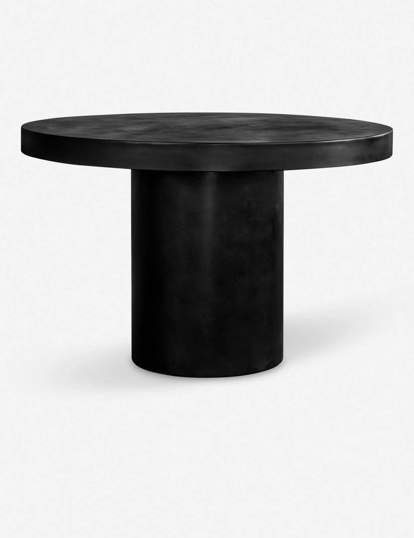 Concrete construction in a sleek black finish is perfectly balanced by the round design of this pedestal table. The thick pillar base and circular tabletop offer a refined silhouette that makes for a versatile dining table, whether anchoring an outdoor space or setting off a moody dining room look.