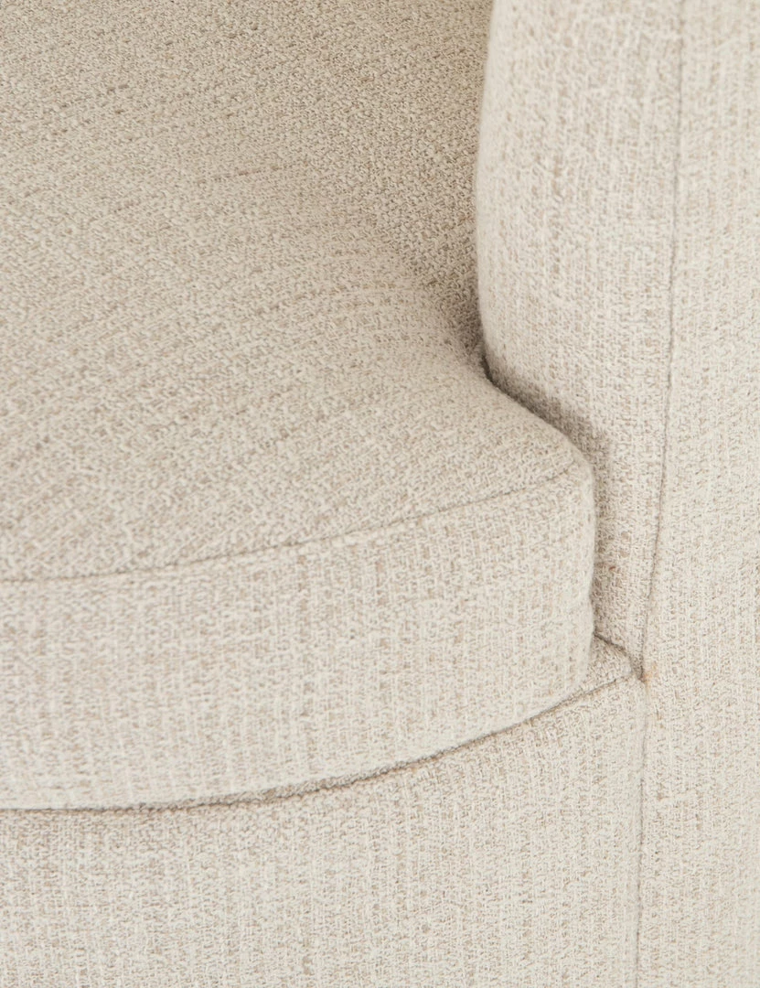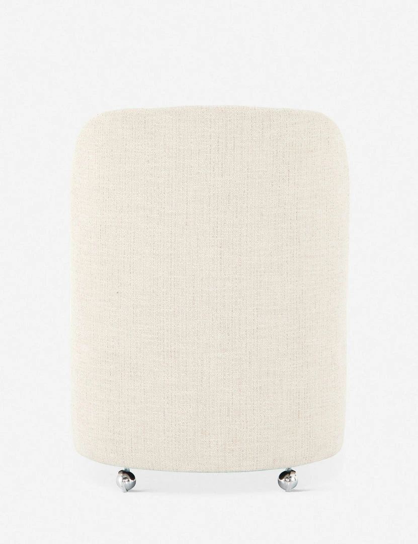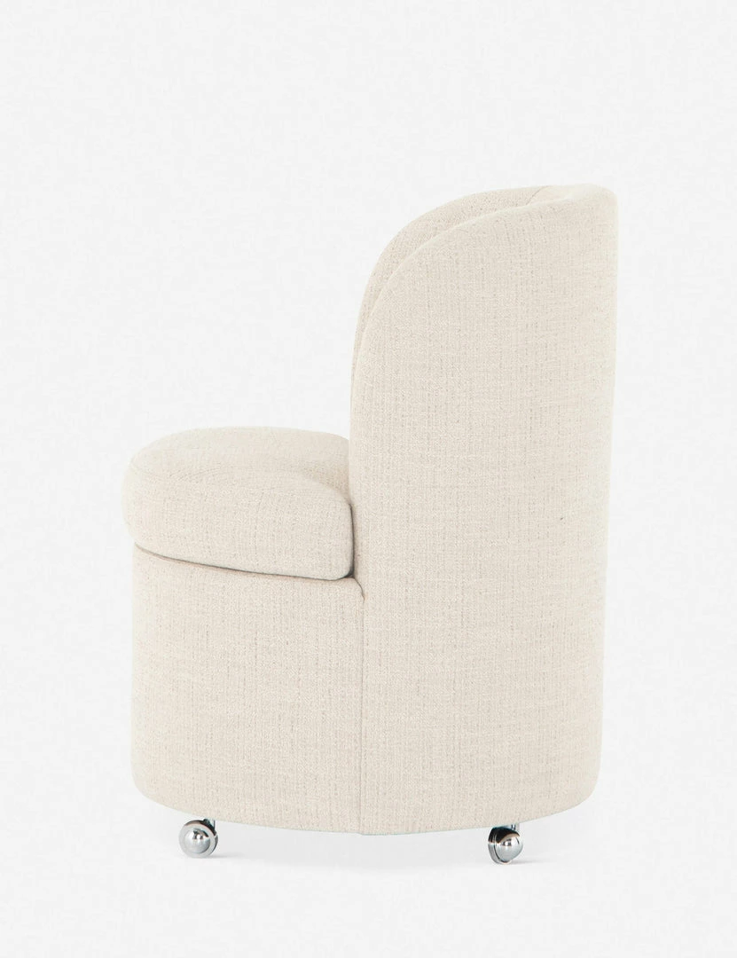 Beautifully balance a standout, shapely design and effortless mobility at your dinner table with this dining room chair. A drum-style seat and curved back are fully tailored in a textural, cream-colored upholstery, so this dining chair seemingly floats above chrome casters. We love sitting this dining chair with lighter wood finishes and refined neutrals.