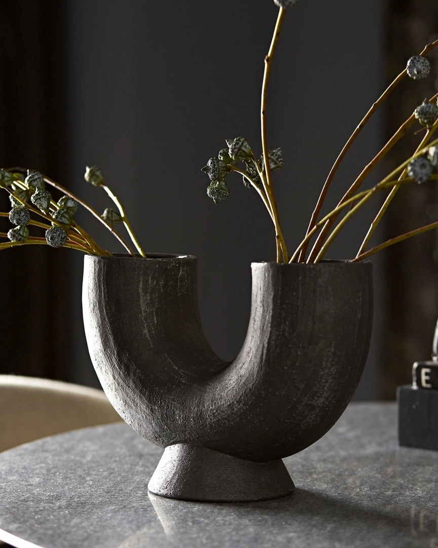 This half-circle table sculpture vase makes a modern statement with its tubular form and matte black glaze. Boasting natural terracotta textures, it’s a stunning addition to any console, coffee table, or home office.