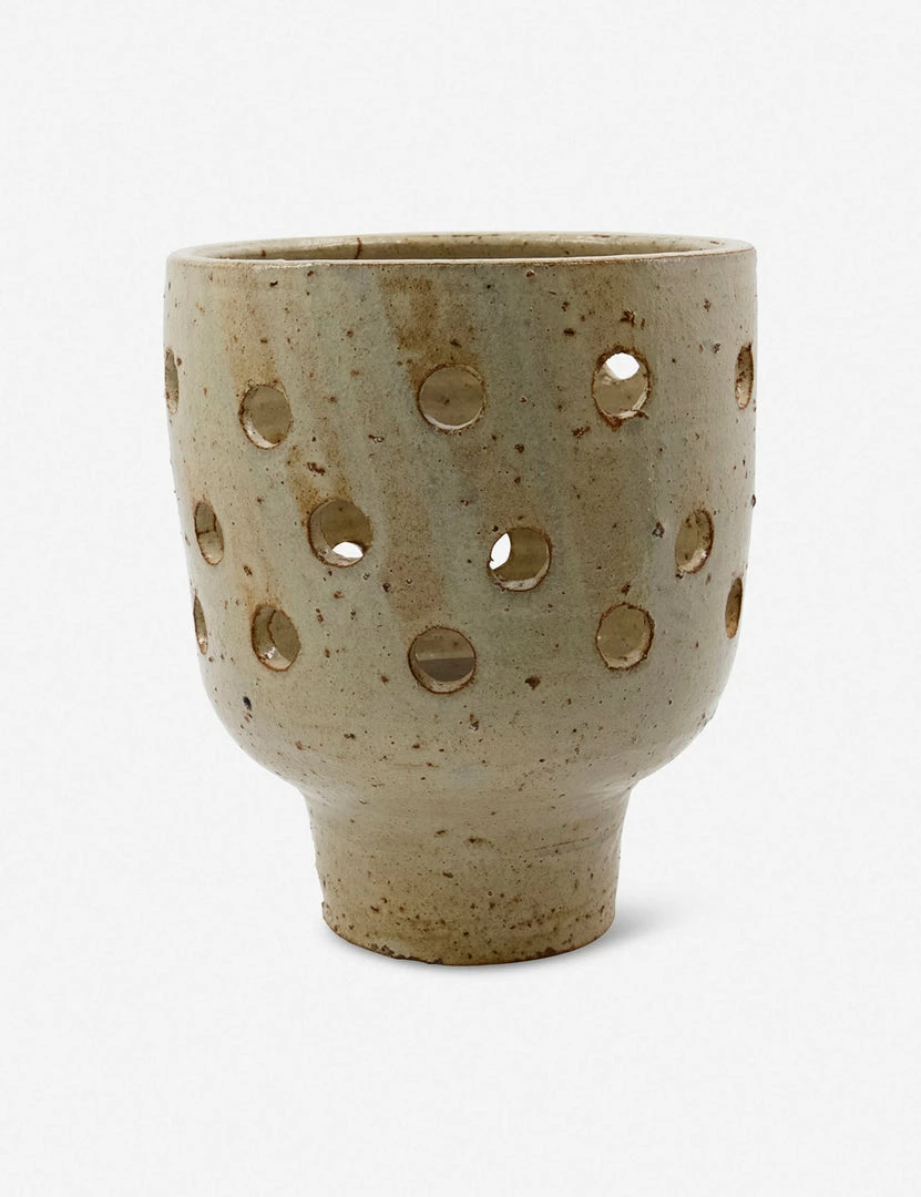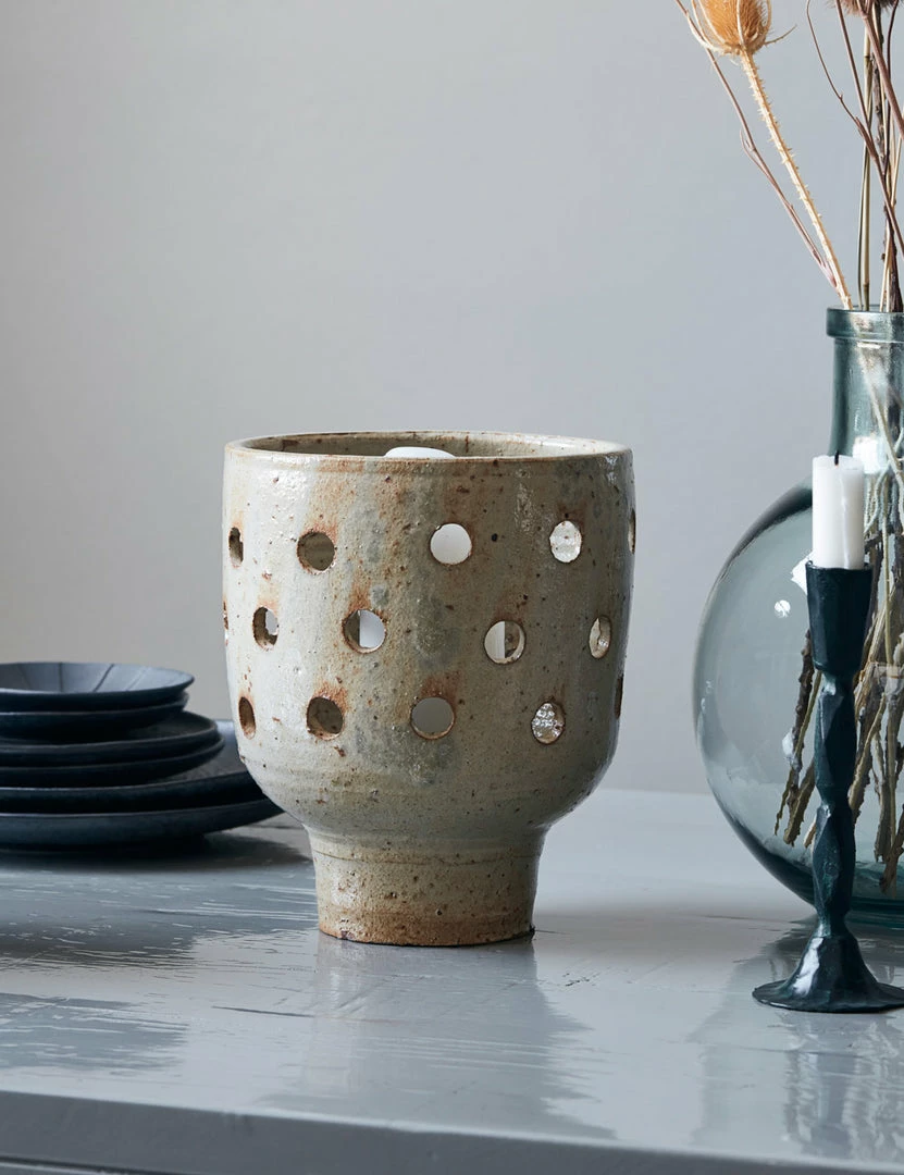 Create an atmosphere of effortless warmth with this beautiful ceramic vase and hurricane. The rich glaze, organic form, and pierced holes give this stoneware piece a rich artisan character that becomes a dynamic silhouette when holding candlelight.