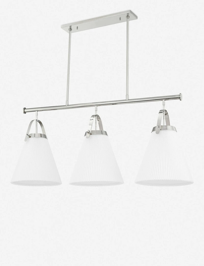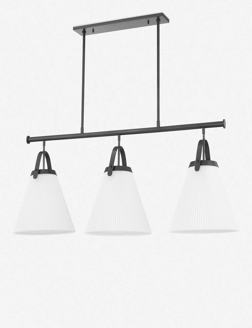 This chic pendant light fixture updates classic notes with a modern, streamlined silhouette. The sleek metal frame holds three lights with ruffled Belgian linen shades in a linear pendant design that’s set for transitional appeal.
