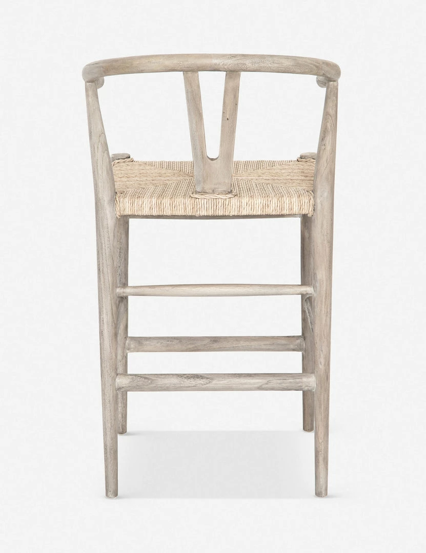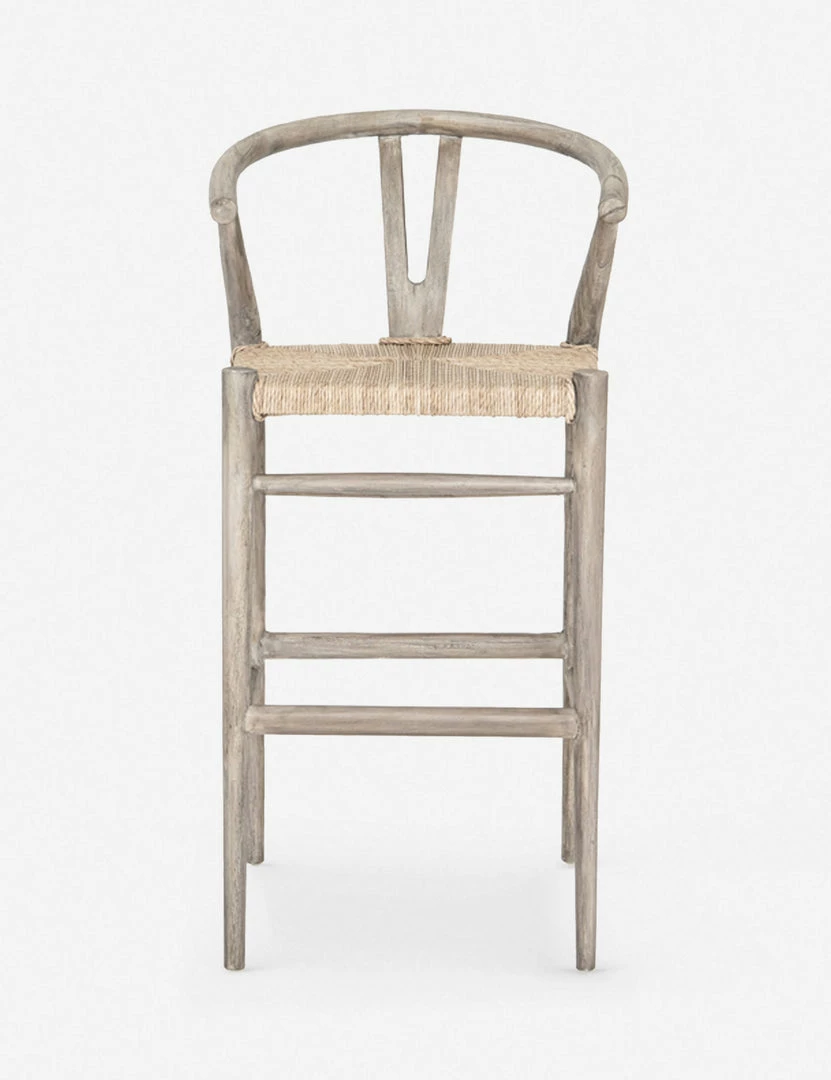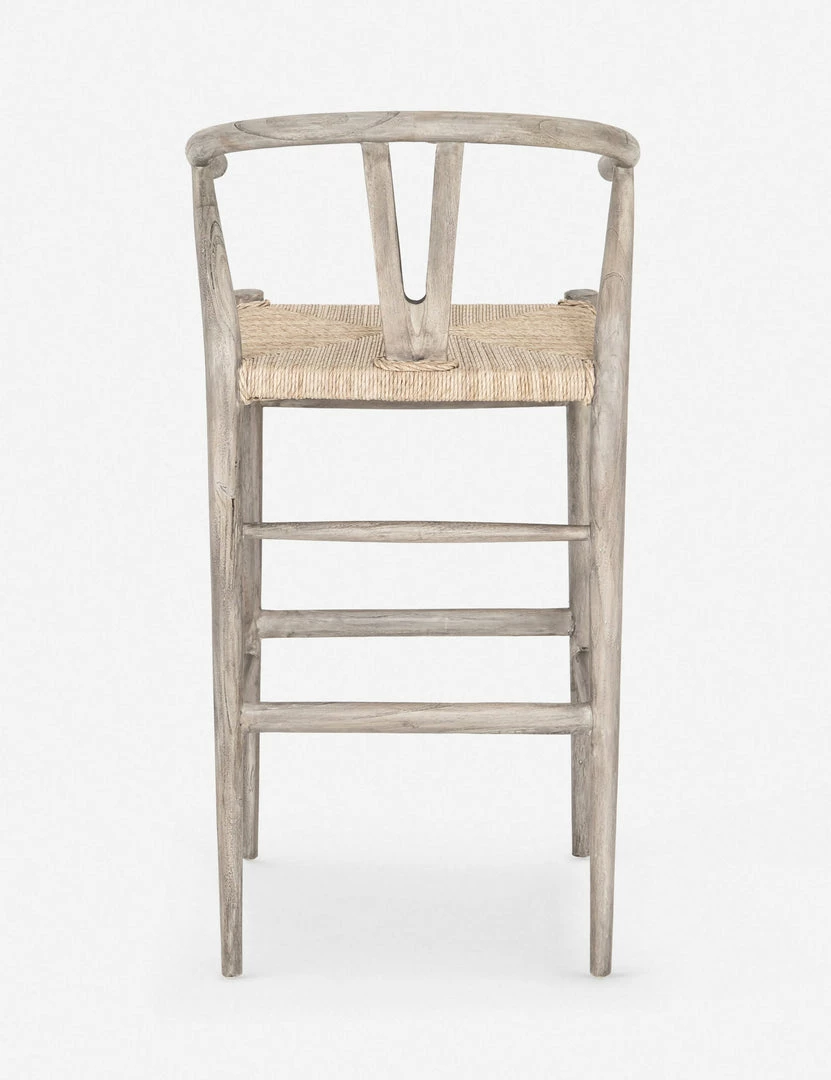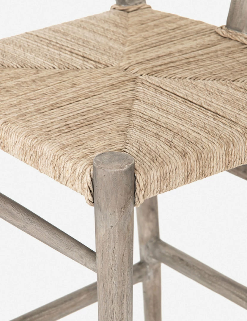 Perfect for transitional dining-room bars, this stool features a woven seat, curved back and weathered wood finish.