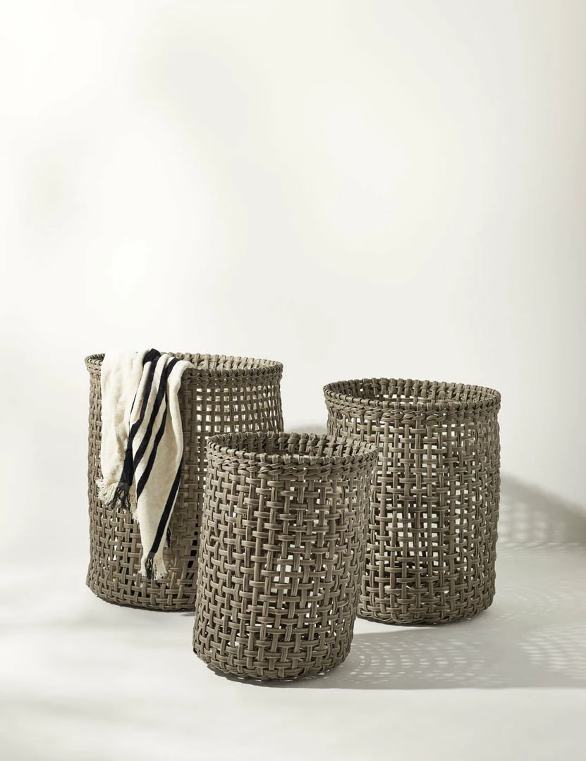 A versatile set of three useful baskets. The open weave is crafted using recycled plastics for added durability, making them an ideal pick for storage or laundry, and the stackable design is great for small spaces!
