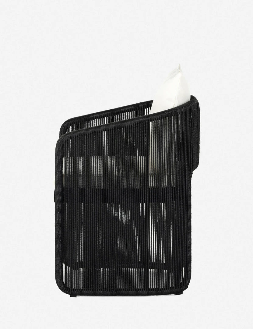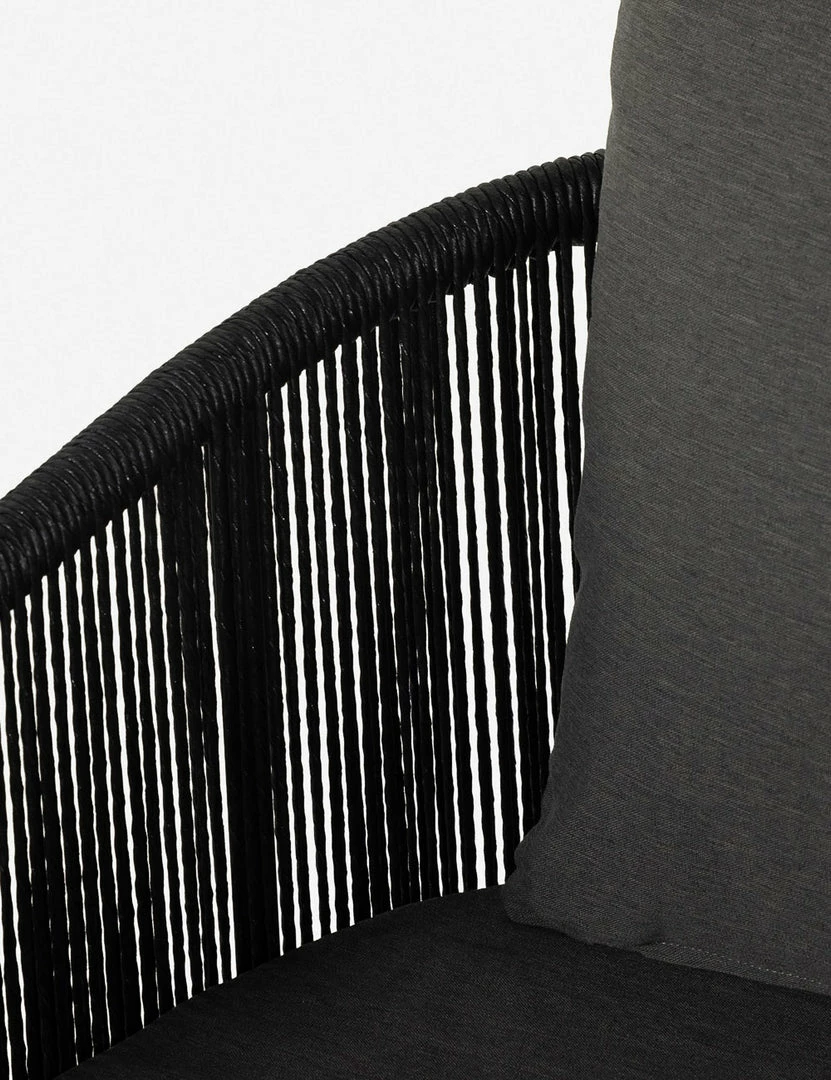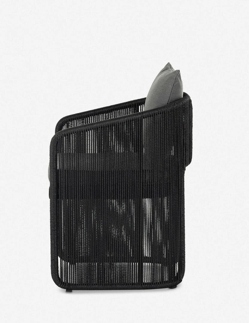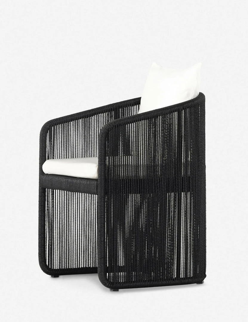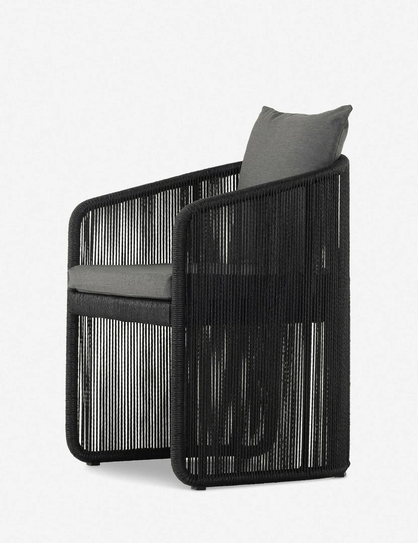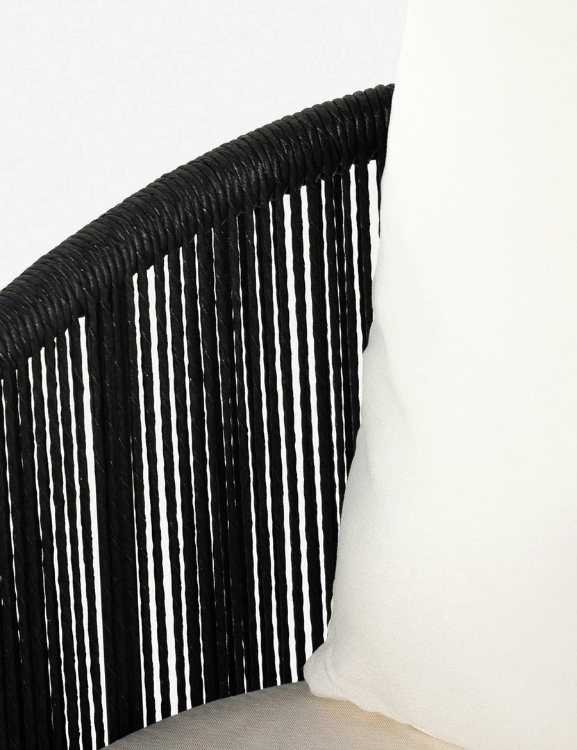 An intricately woven barrel frame and performance upholstered cushions create a textural dining chair for a fresh air dining set or chic breakfast nook. We love the modern tone and dynamic materials for bringing a dining seat with a fashionable edge to your table.