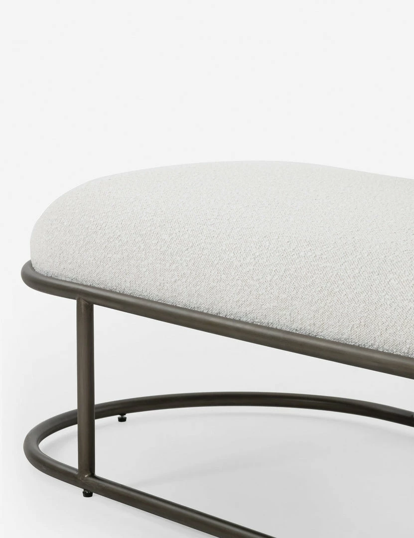 A slate-brushed iron frame and curved chaise-like design are finished in a durable fabric made to mimic the soft texture of bouclé in a light neutral tone that will fit most spaces. This streamlined chaise is an ideal way to add some elevated, cozy seating to an airy or transitional space.