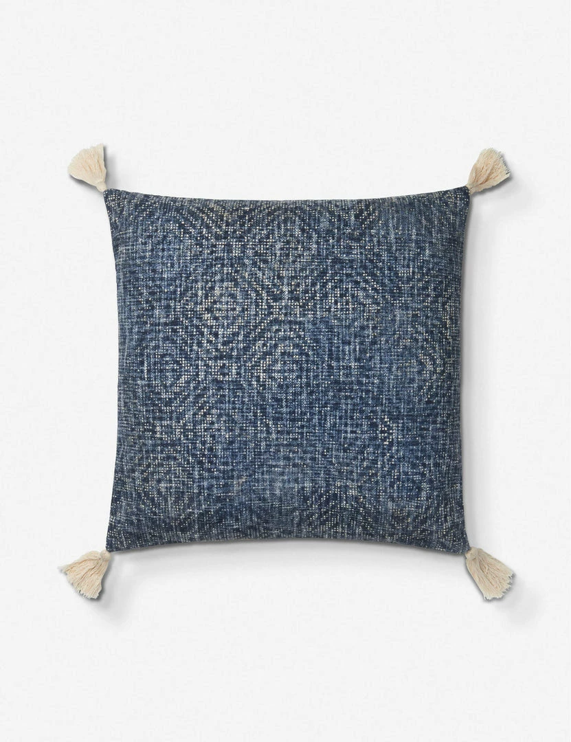An allover embroidered geometric design and tassel corners brings fun texture to your space. We love the washed indigo effect for a more casual look.
