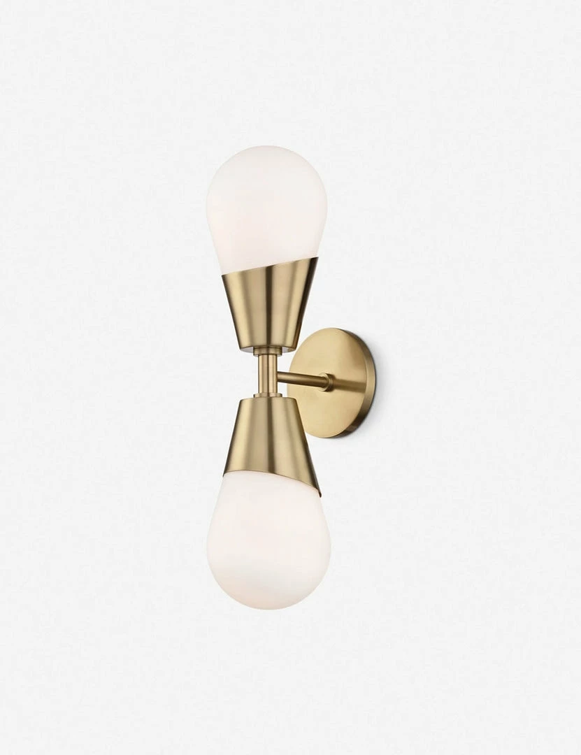 The perfect transitional piece, this sconce features two teardrop-shaped frosted glass bulbs wrapped in golden aged brass for a sleek, contemporary look.