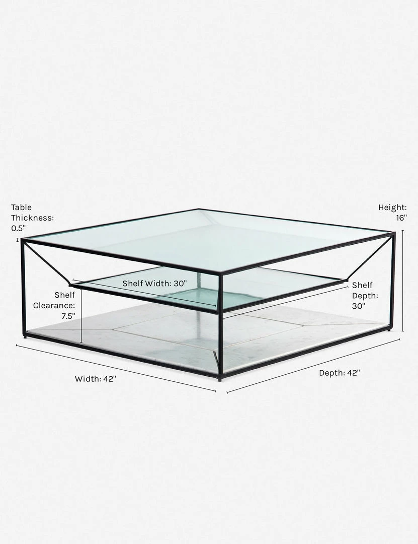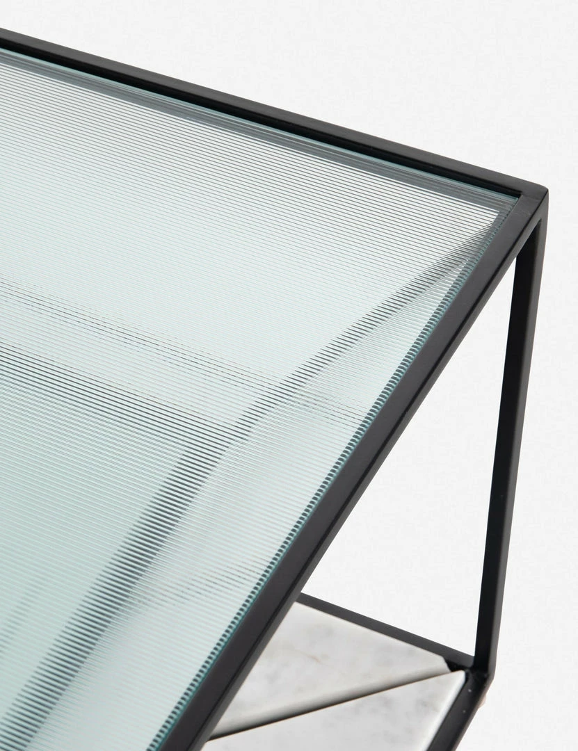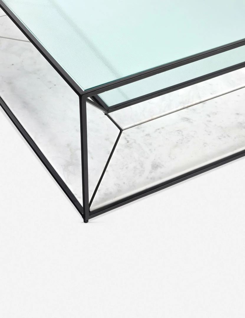 The mixed materiality of this square coffee table feels surprisingly light and airy with its open frame, fluted glass top and shelf, and polished white marble base. That shelf elegantly suspends down from the black-finished iron frame and all three levels provide ample space to display your favorite coffee table books and curios.