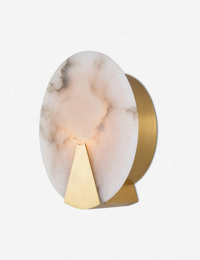 Give your well-rounded style a luxe upgrade with this lovely alabaster wall sconce. The circular design as a marbled effect, and brass metal framing for a touch of shine. The diffused illumination gives a soft glow to bathrooms and hallways.