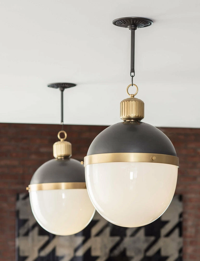 A mix of mod design and industrial elements makes this a fun lighting piece that doesn’t skimp on style. Featuring a frosted glass globe shade, topped with iron and brass detailing, our stylists are doubling (and tripling!) up to maximize its impact over kitchen islands and long dining room tables.