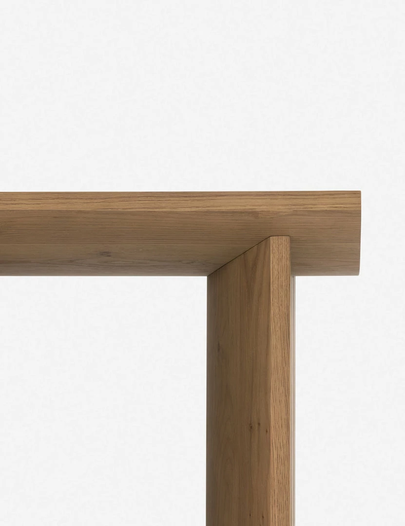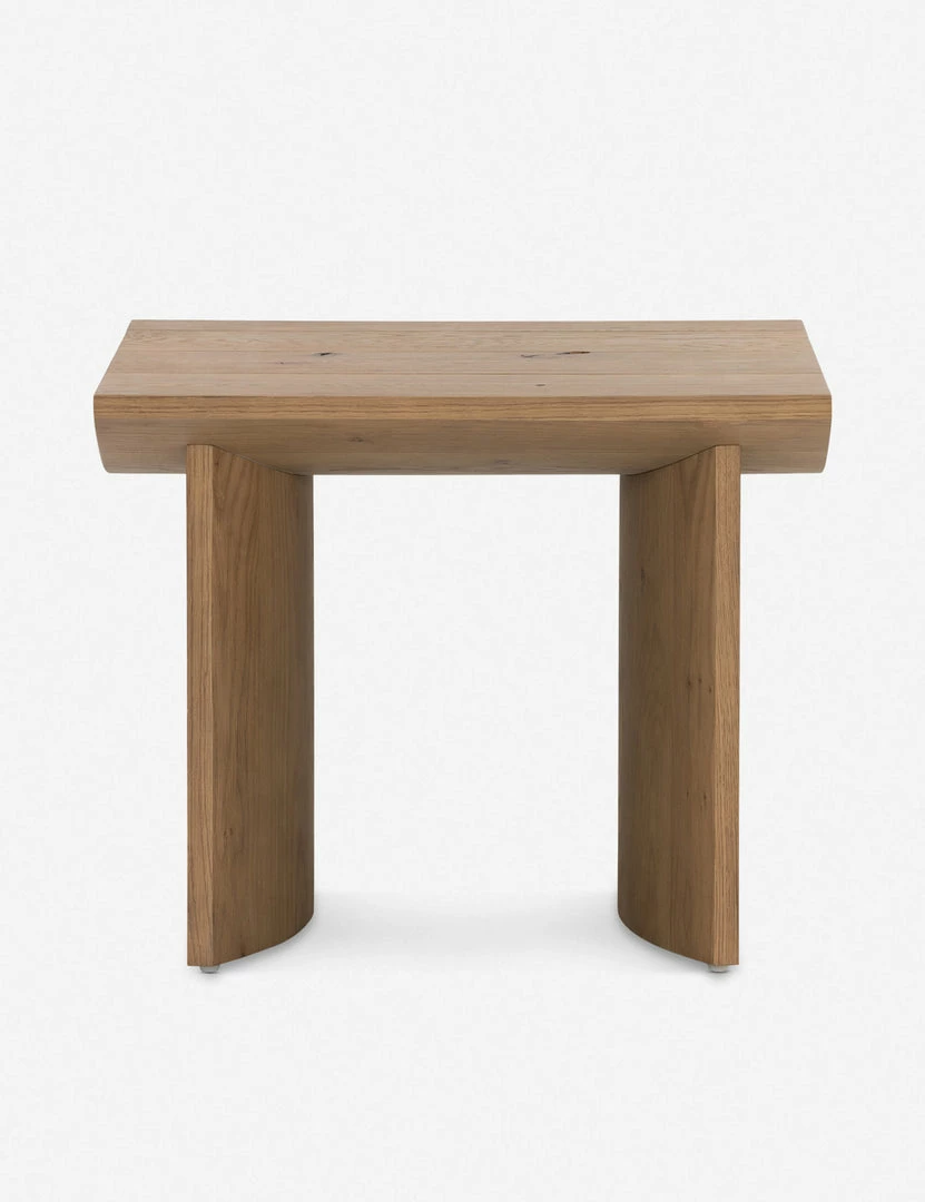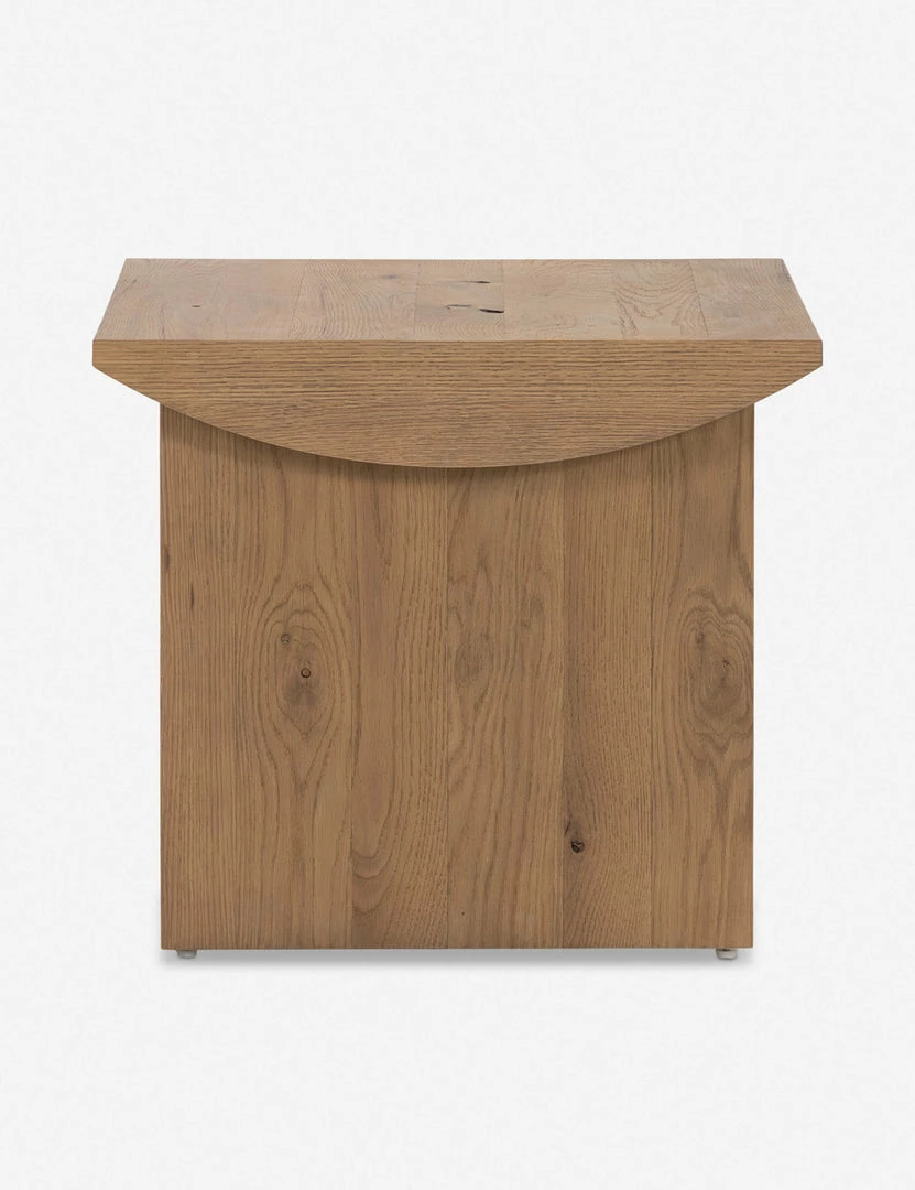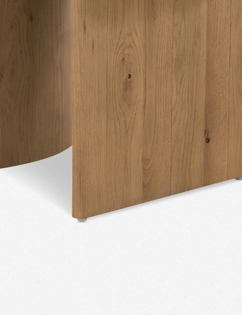Casting a clean, cut silhouette, this side table design is softened by a curved-bottom tabletop sturdily set on two flat, solid legs. Clad in a beautiful oak veneer for natural grain appeal, this end table can bring a warm, polished touch beside your favorite chair or sofa.