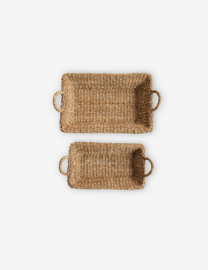 Two handwoven trays feature a double-walled seagrass construction to offer a sturdy, functional accent. Arrange this set of artisan crafted trays separately or together to provide the perfect catchall for counters or tables from the kitchen to the bathroom.