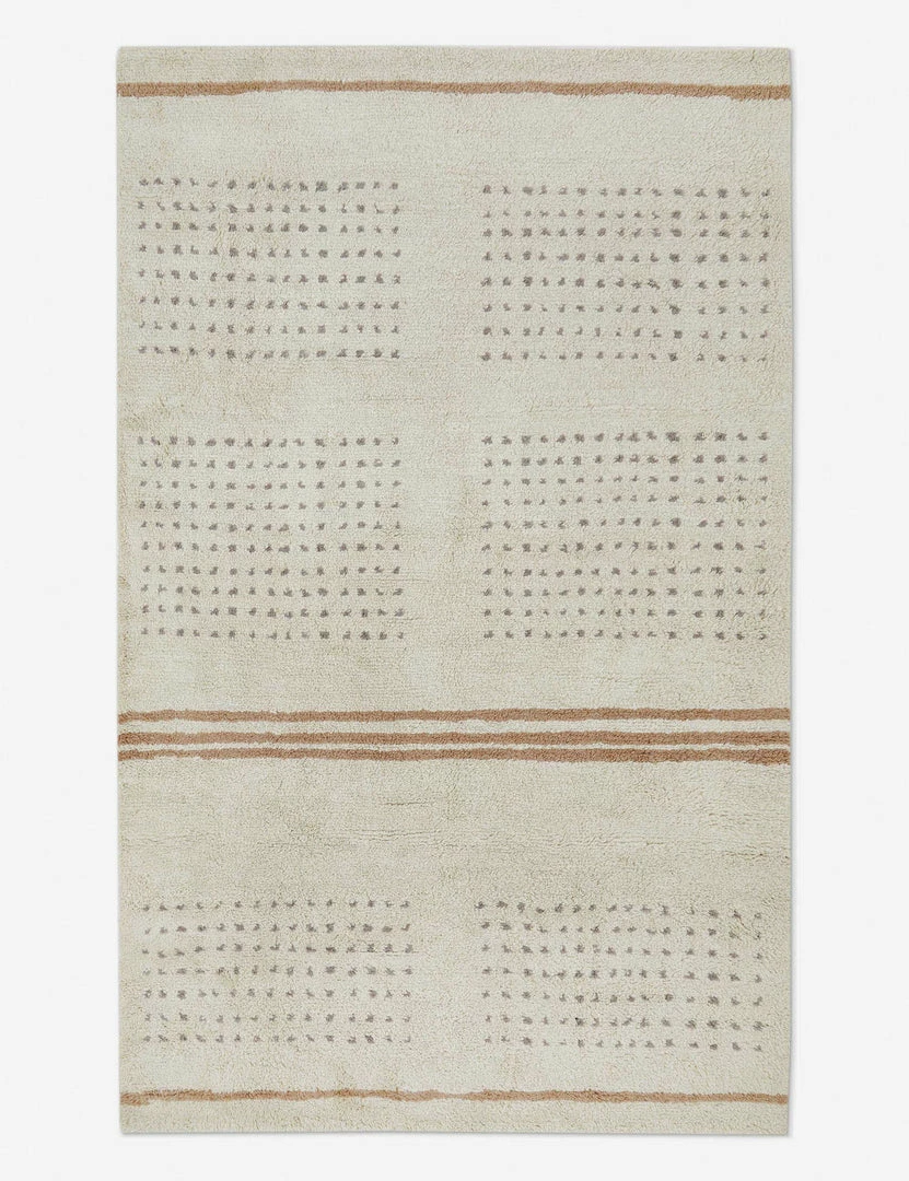 Inspired by the repetitive motifs and super soft pile of vintage Gabbeh rugs, this hand-knotted Rina floor rug features a simple geometric design of dots and stripes in a neutral palette. Crafted from a wool-viscose blend, this is an inviting area rug for your living room or bedroom.
