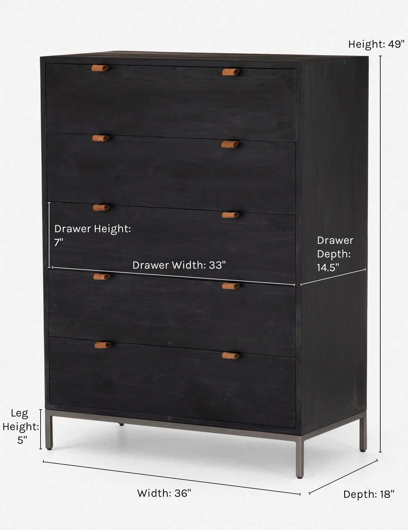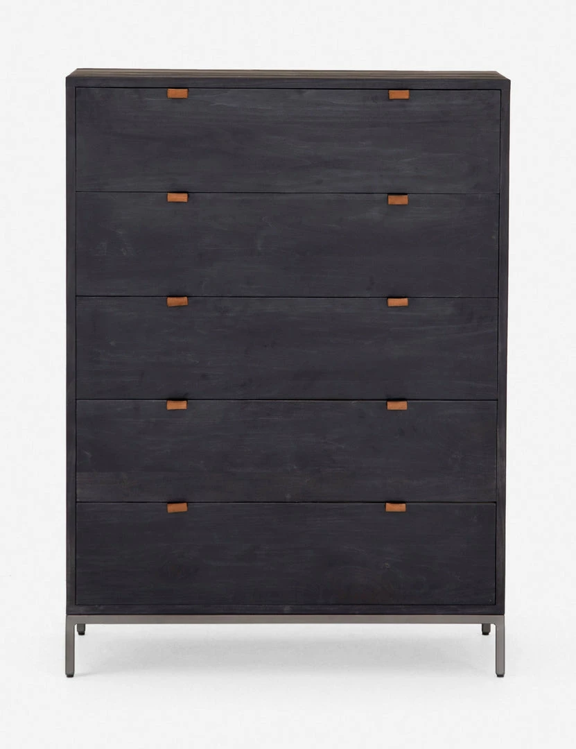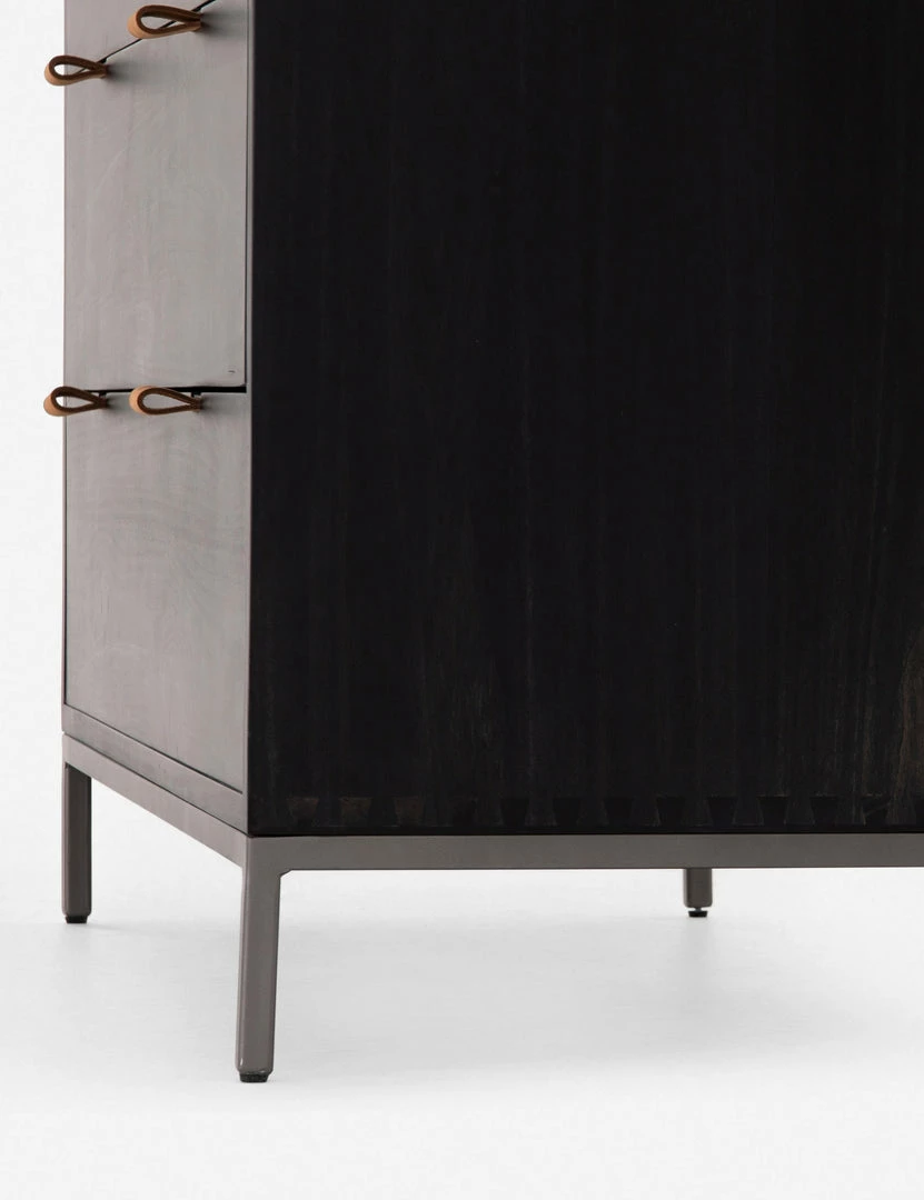 Keep your bedroom style grounded (and clutter-free) with this tall wooden dresser. Featuring a black wash, slim iron base, and top-grain leather drawer pulls, this bedroom side table mixes materials for an impressive finish.