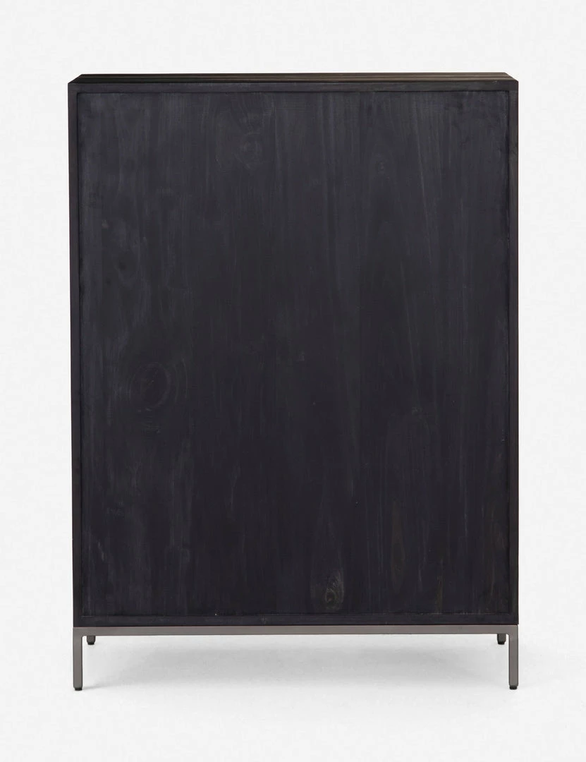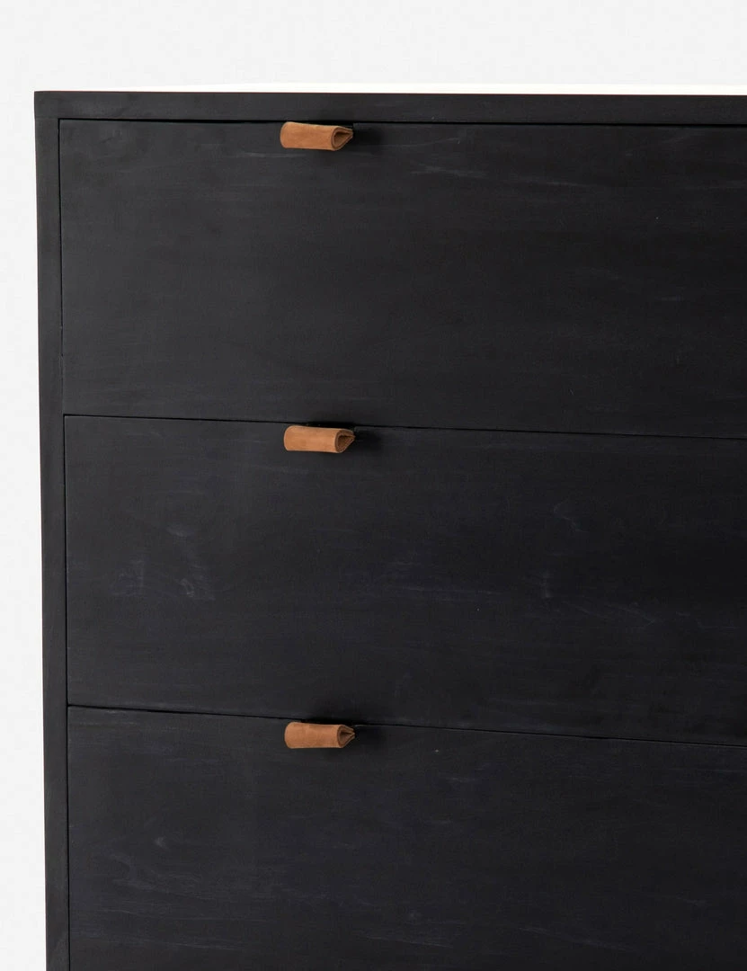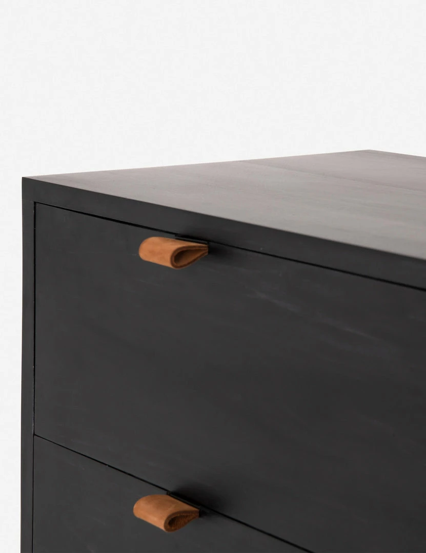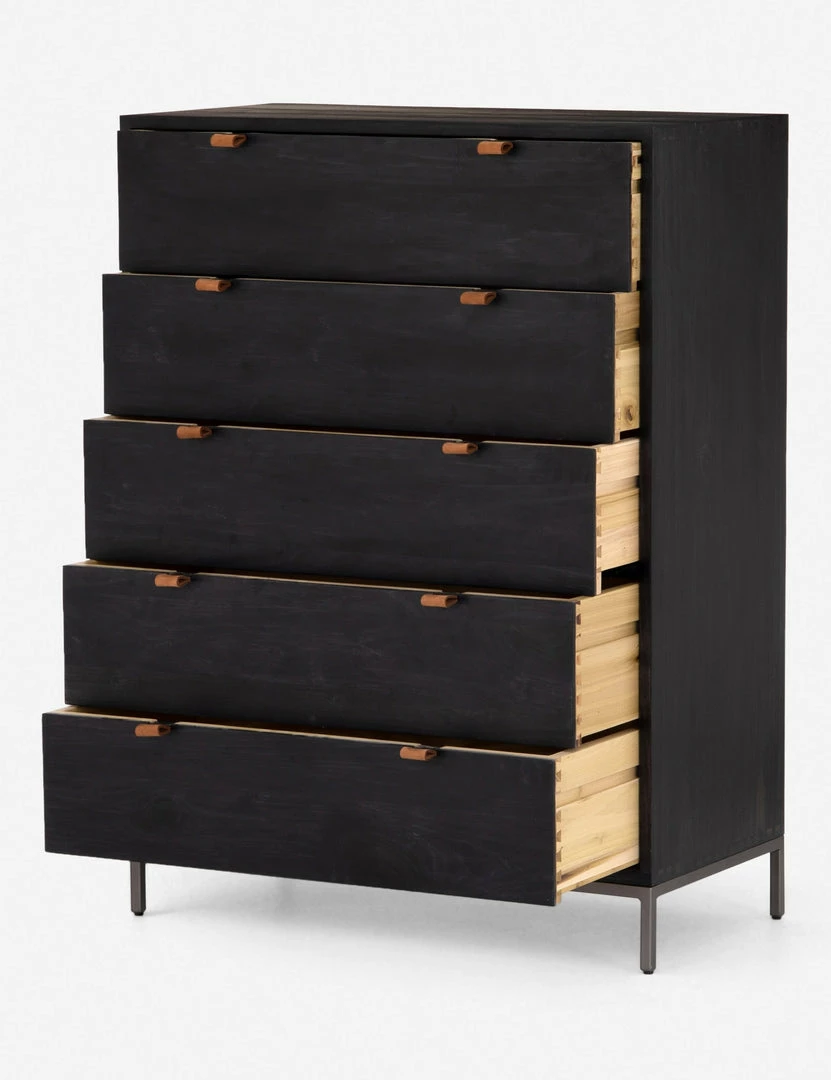 Keep your bedroom style grounded (and clutter-free) with this tall wooden dresser. Featuring a black wash, slim iron base, and top-grain leather drawer pulls, this bedroom side table mixes materials for an impressive finish.