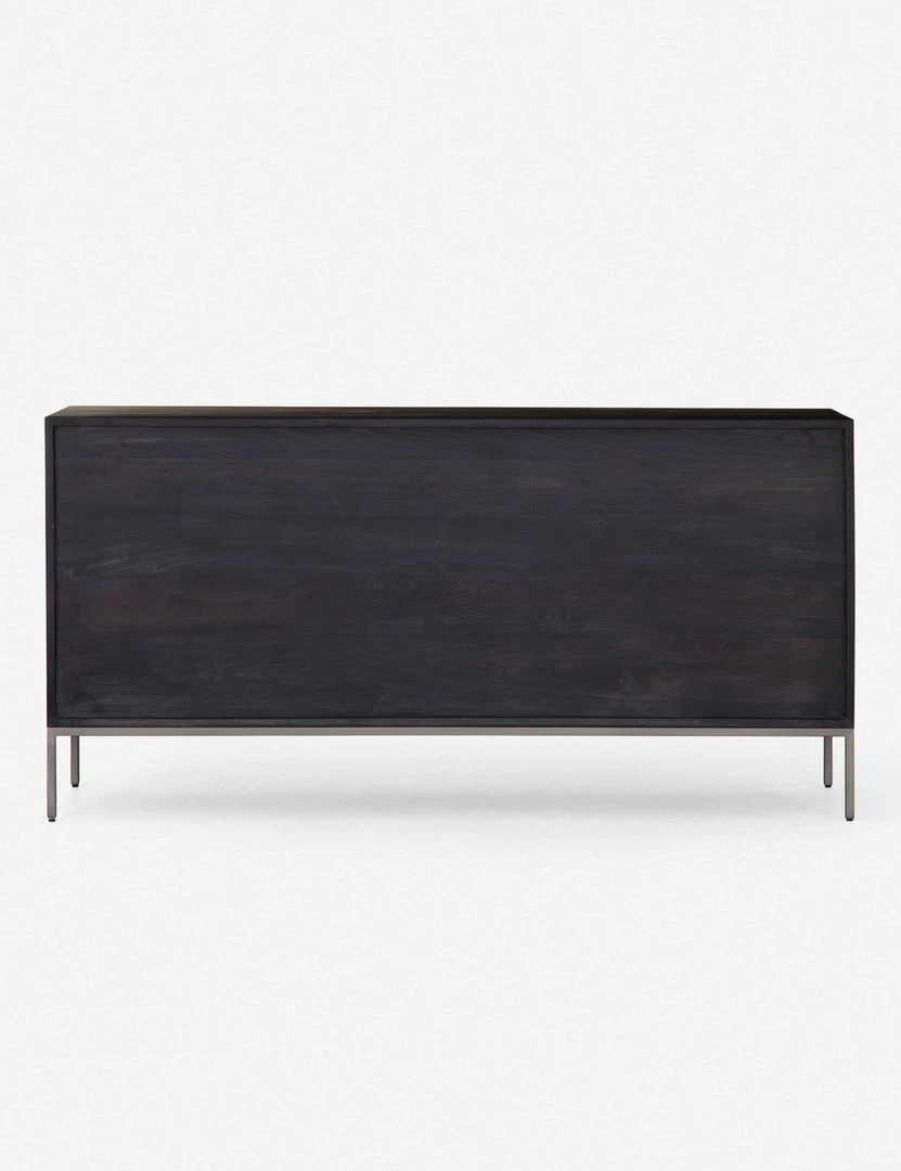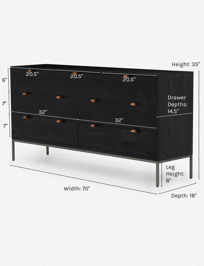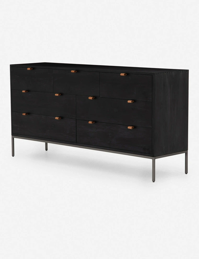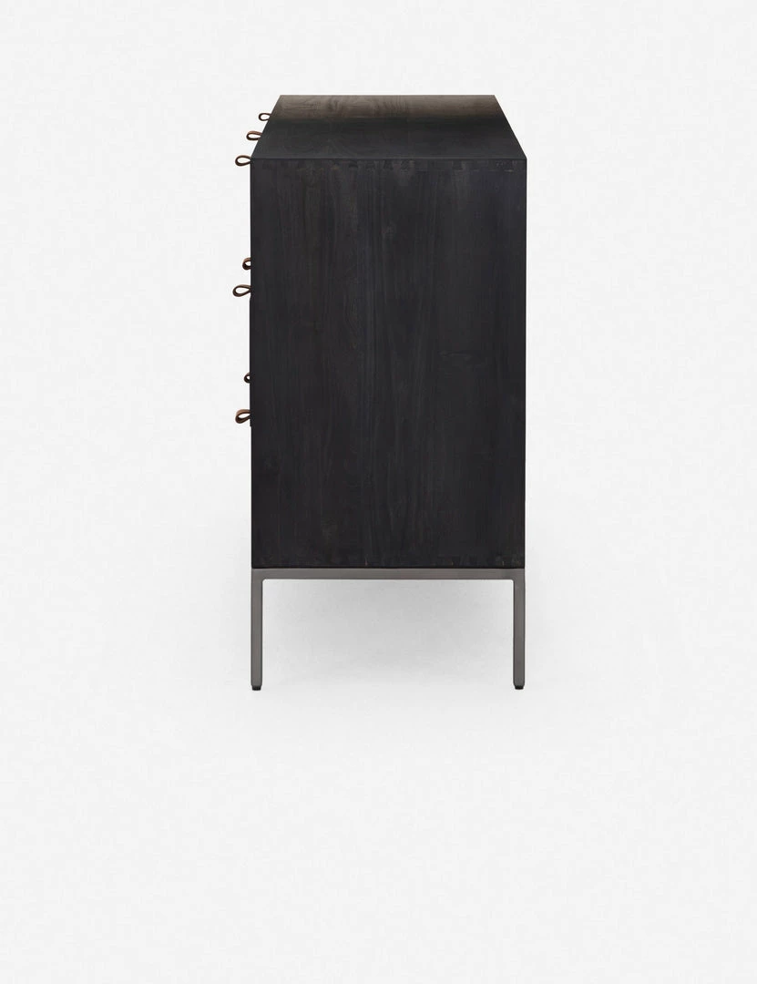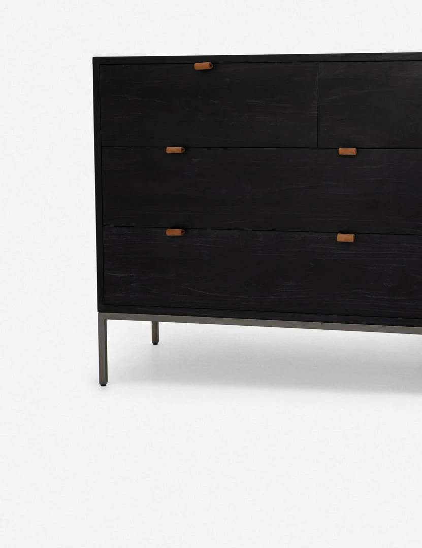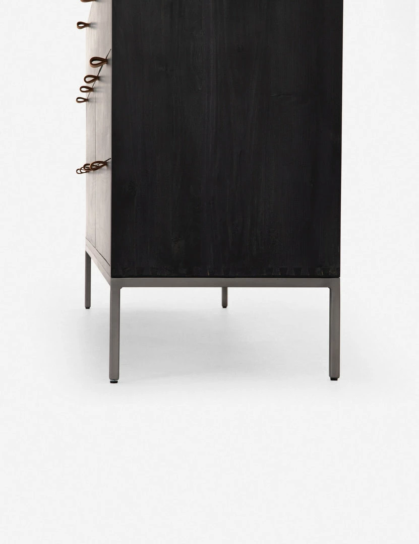 Keep your bedroom style grounded (and clutter-free) with this wooden dresser. Featuring a black wash, slim iron base, and top-grain leather drawer pulls, this bedroom side table mixes materials for an impressive finish.