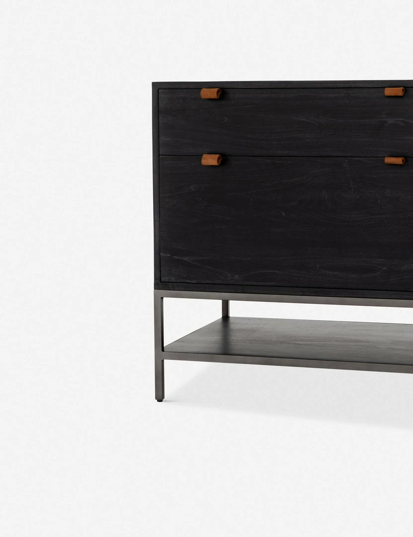 Keep your office style grounded (and super organized) with this wooden filing cabinet. Features elements of mid-century aesthetics like a black wash, slim iron base, and top-grain leather drawer pulls.