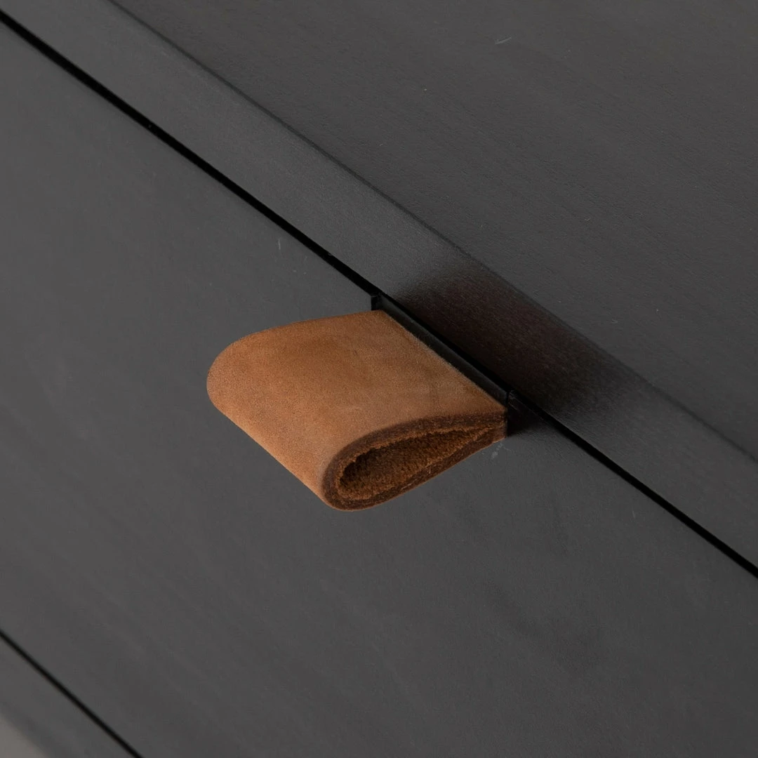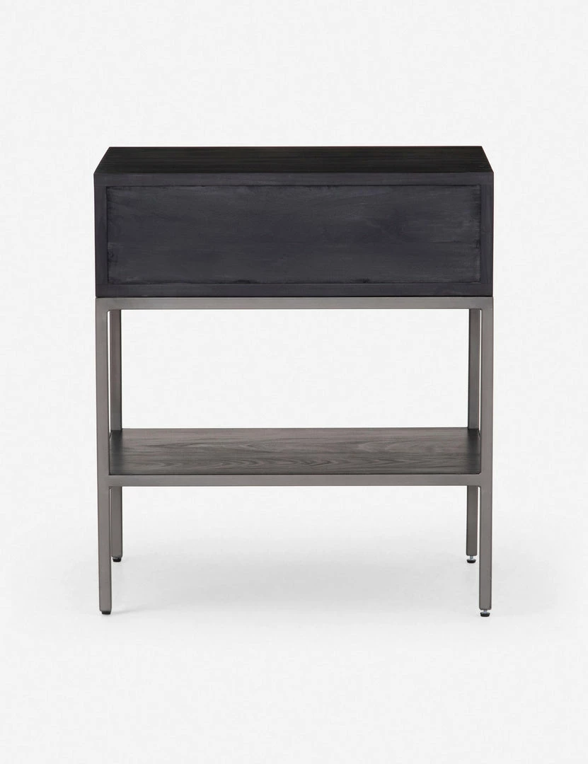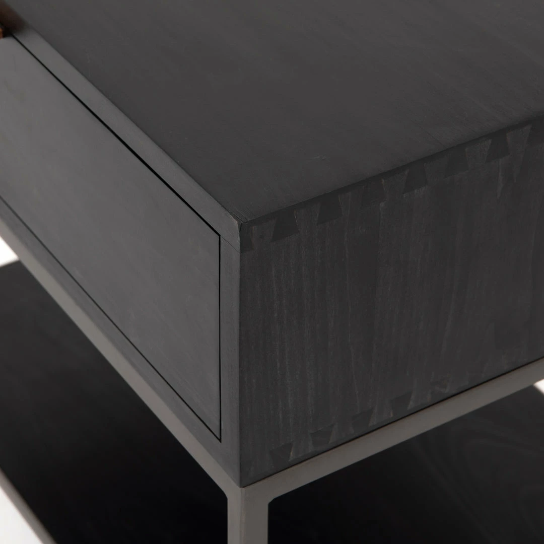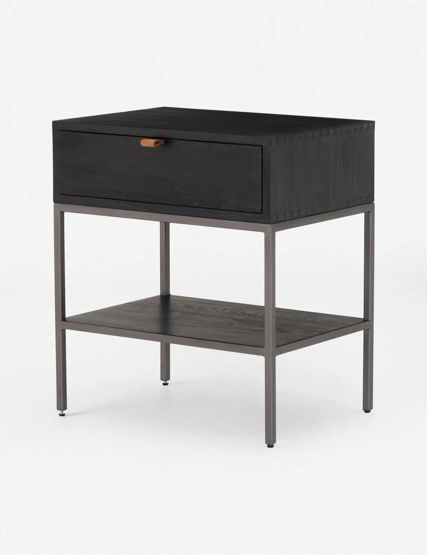 Keep your bedroom style grounded (and clutter-free) with this wooden nightstand. Featuring a black wash, slim iron base, and top-grain leather drawer pulls, this bedroom side table mixes materials for an impressive finish.
