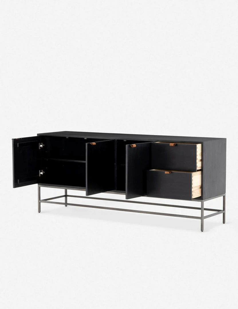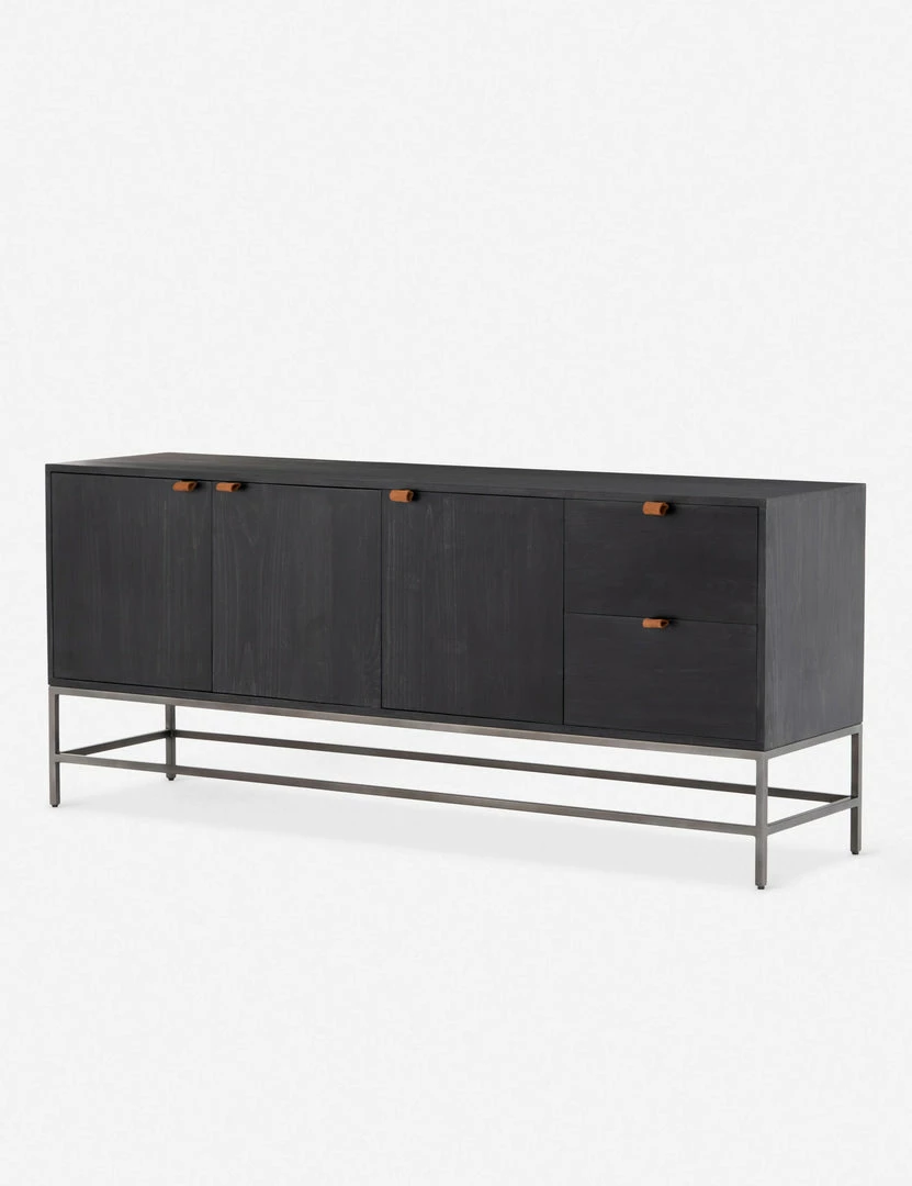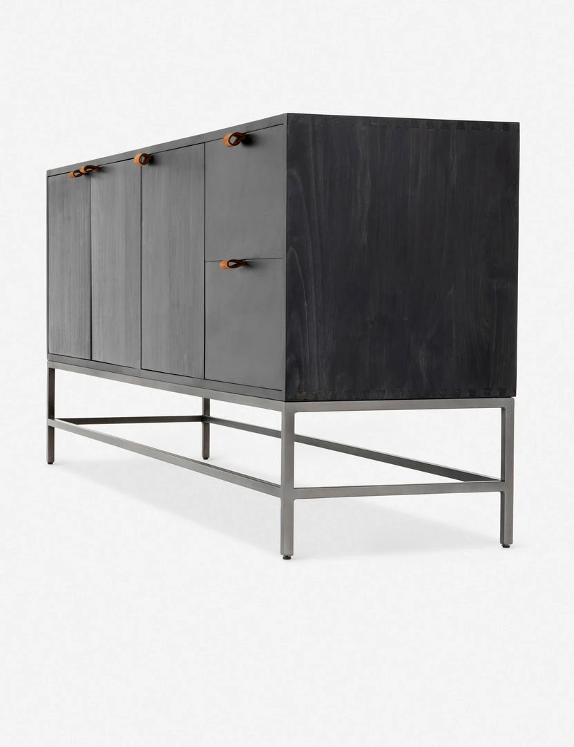 Keep your style grounded (and super organized) with this wooden sideboard cabinet. Features elements of mid-century aesthetics like a black wash, slim iron base, and top-grain leather pulls.