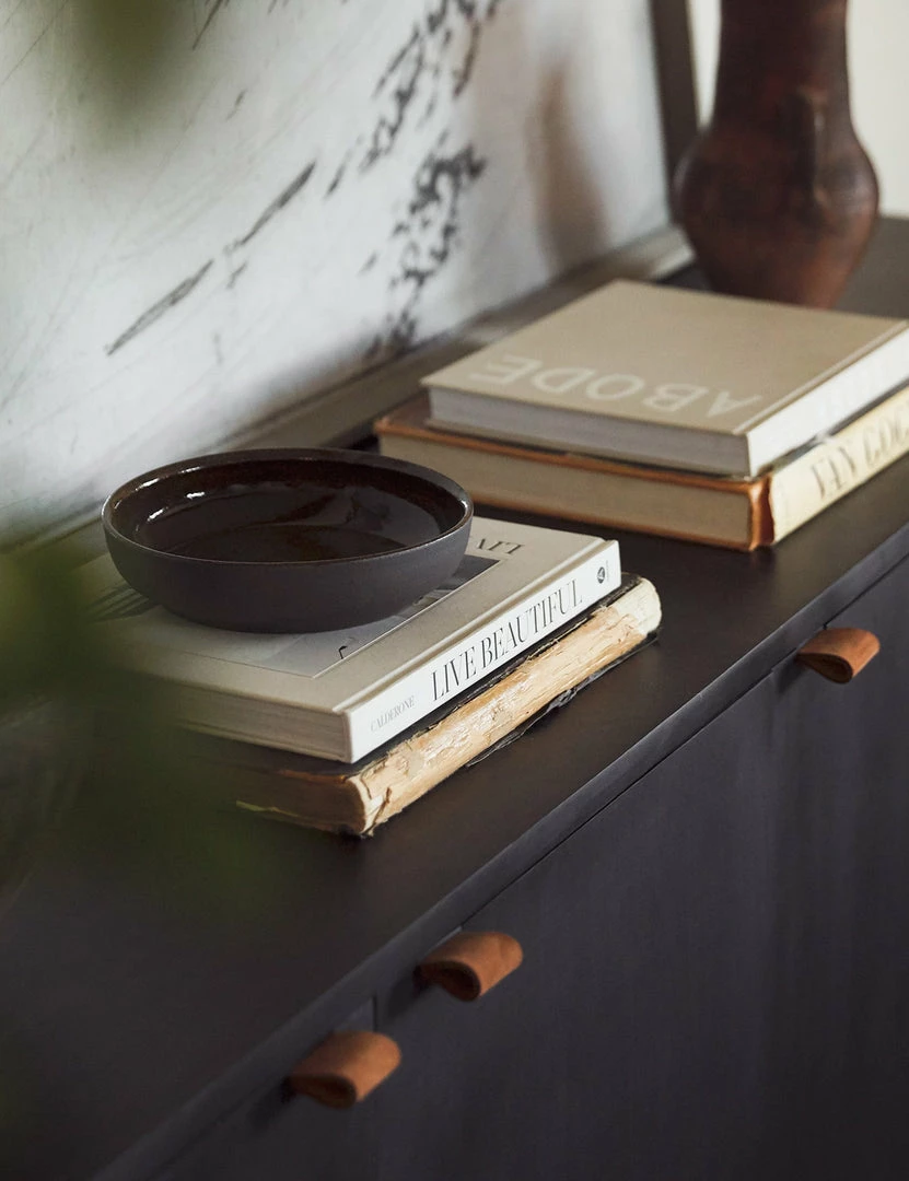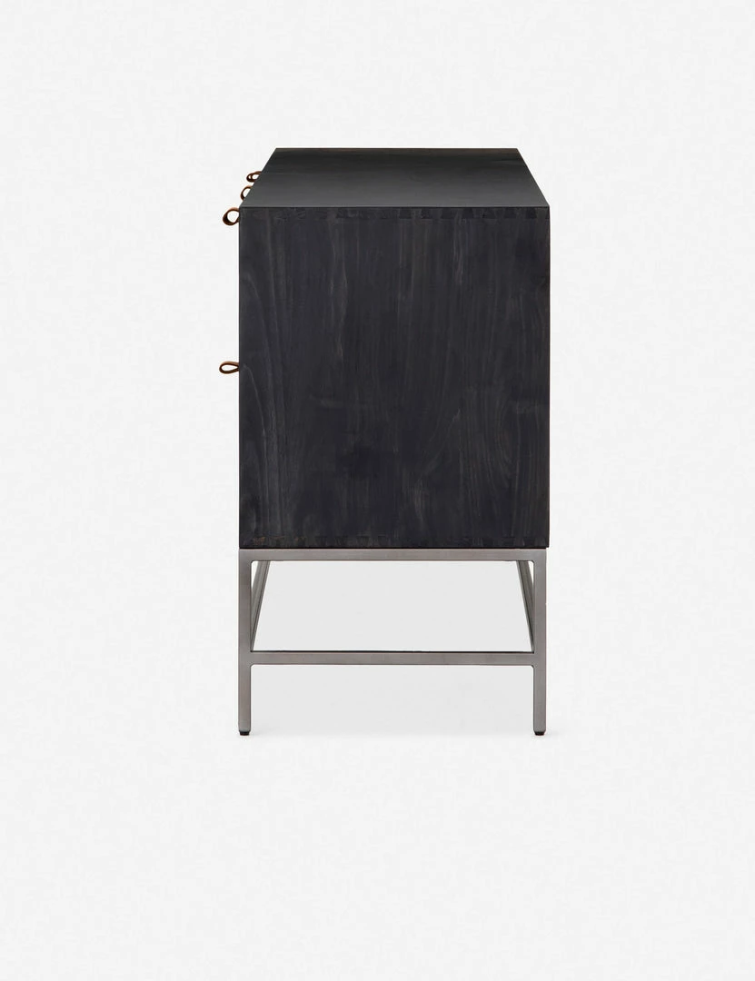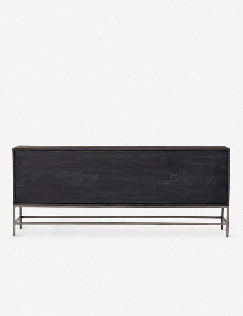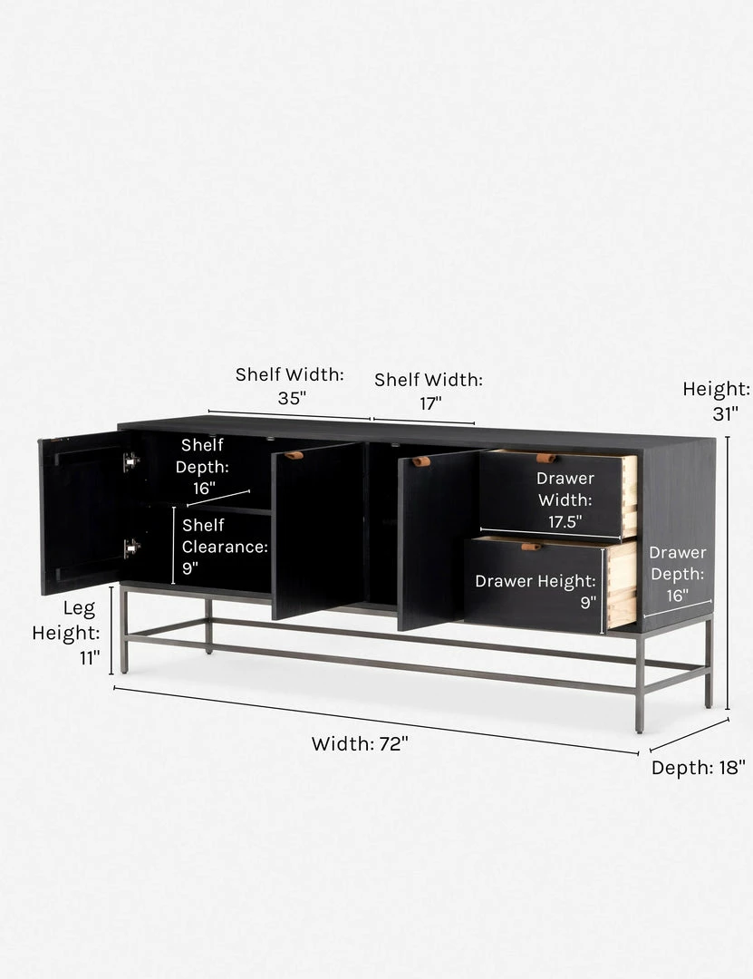 Keep your style grounded (and super organized) with this wooden sideboard cabinet. Features elements of mid-century aesthetics like a black wash, slim iron base, and top-grain leather pulls.
