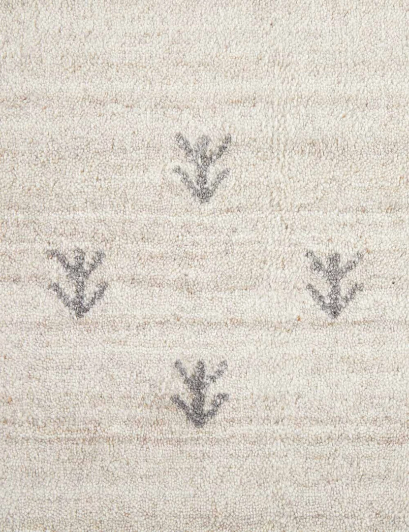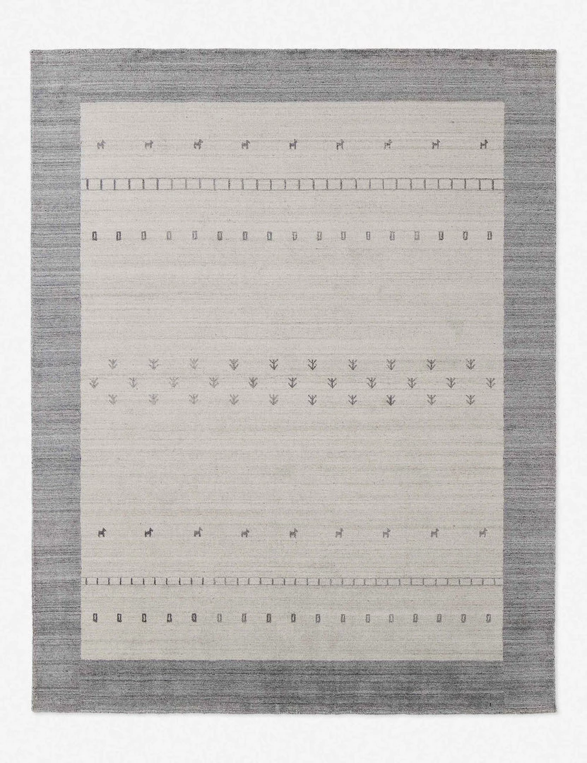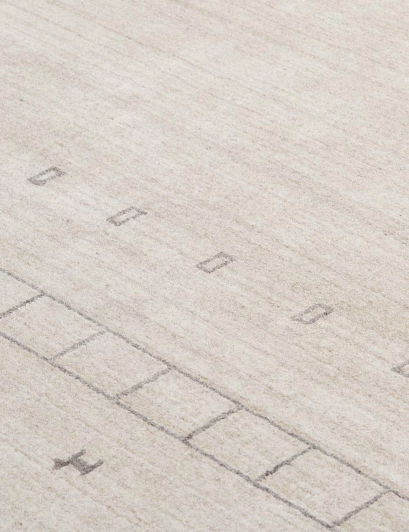 Hand-knotted from wool and viscose, this plush pile rug offers a cool, clean aesthetic. Its motif features a balanced pattern of bars and glyphs in a beautifully minimal arrangement. With notes from traditional Gabbeh designs, this naturally-inspired floor rug offers the perfect anchor for a space that blends organic textures with refined touches.