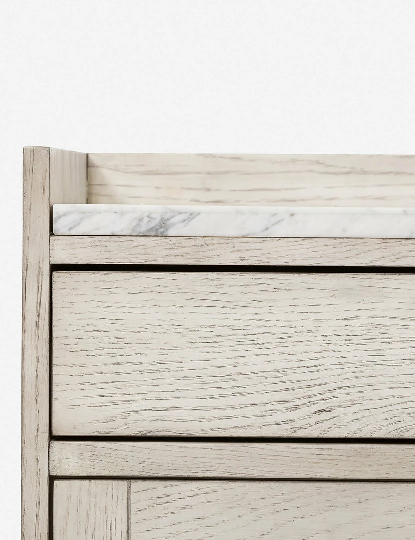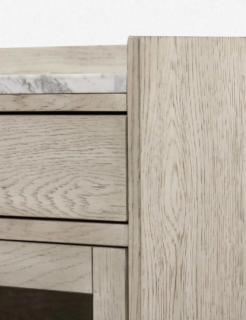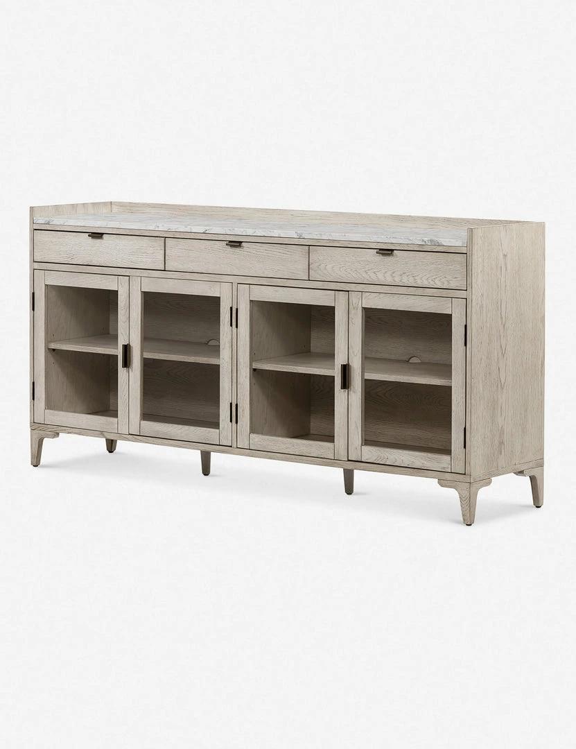 A white oak veneer makes for a simple yet sturdy sideboard cabinet, ideal for a light and airy space. With three drawers and glass cabinet doors opening to spacious interior shelving, this is the perfect sideboard for elevated storage and display in your dining room or living space.