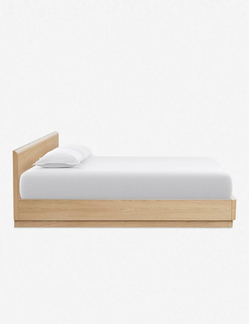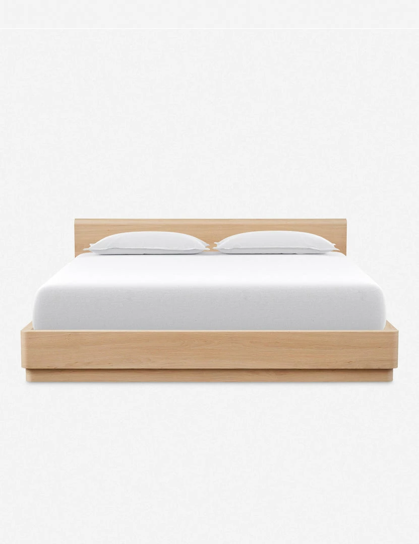A beautiful platform bed from the Ryland Collection featuring solid oak construction with softly molded corners and a low-slung design. Clean, gentle lines and sleek wood grain are highlighted by a light, natural finish for a look that is understated and refined. This plinth base bed frame with headboard offers a sturdy silhouette that will ground your bedroom with a modern tone.