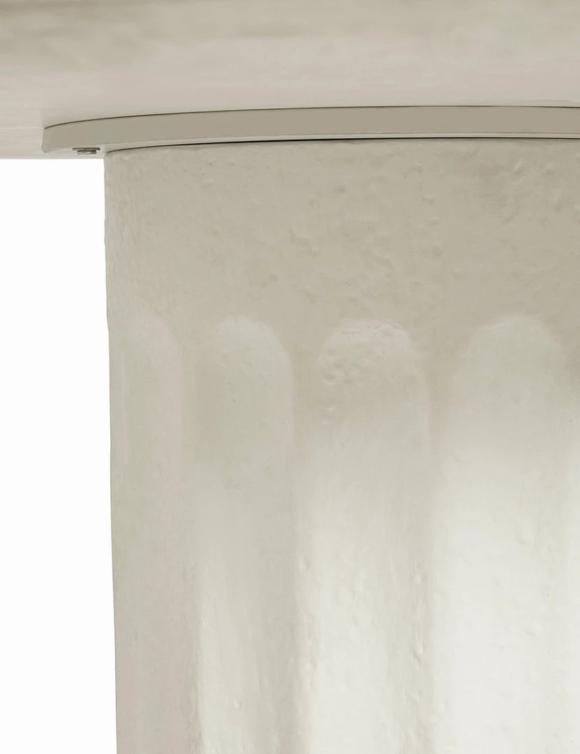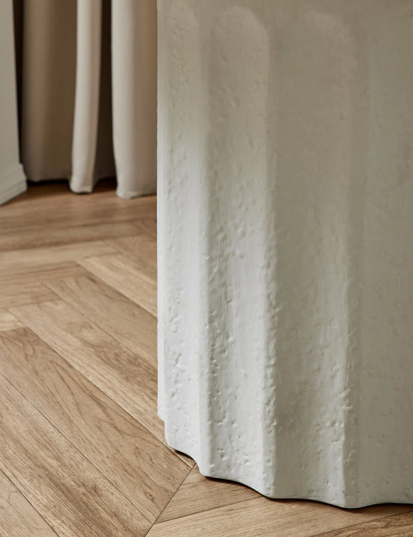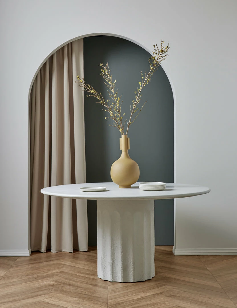 Classical design notes get a modern treatment with this round fiberstone dining table. The textural column-style base supports a polished top to create a refined table design perfect for a kitchen, intimate dining area, or outdoor dining table. This piece is from our exclusive Sarah Sherman Samuel collaboration and features all the trademarks of her warm, edited style.