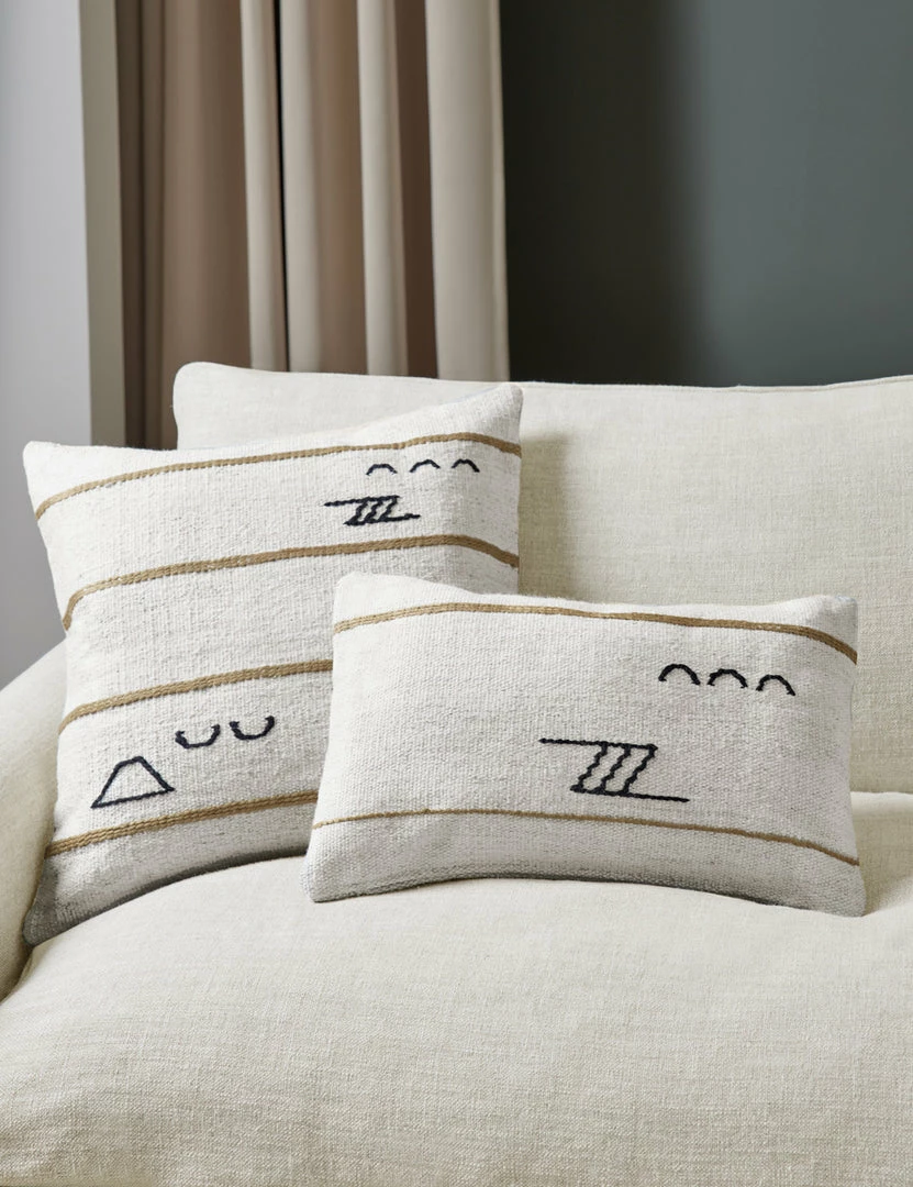Inspired by vintage motifs the Iconic Stripe square and lumbar throw pillows features thin stripes and small, modern symbols for a look that feel both familiar and fresh. This modern wool-blend throw pillow works beautifully with other neutral and earthy tones like clay and sand. The Sarah Sherman Samuel Collection features tonal textures, earthy hues and a modern take on traditional patterns.