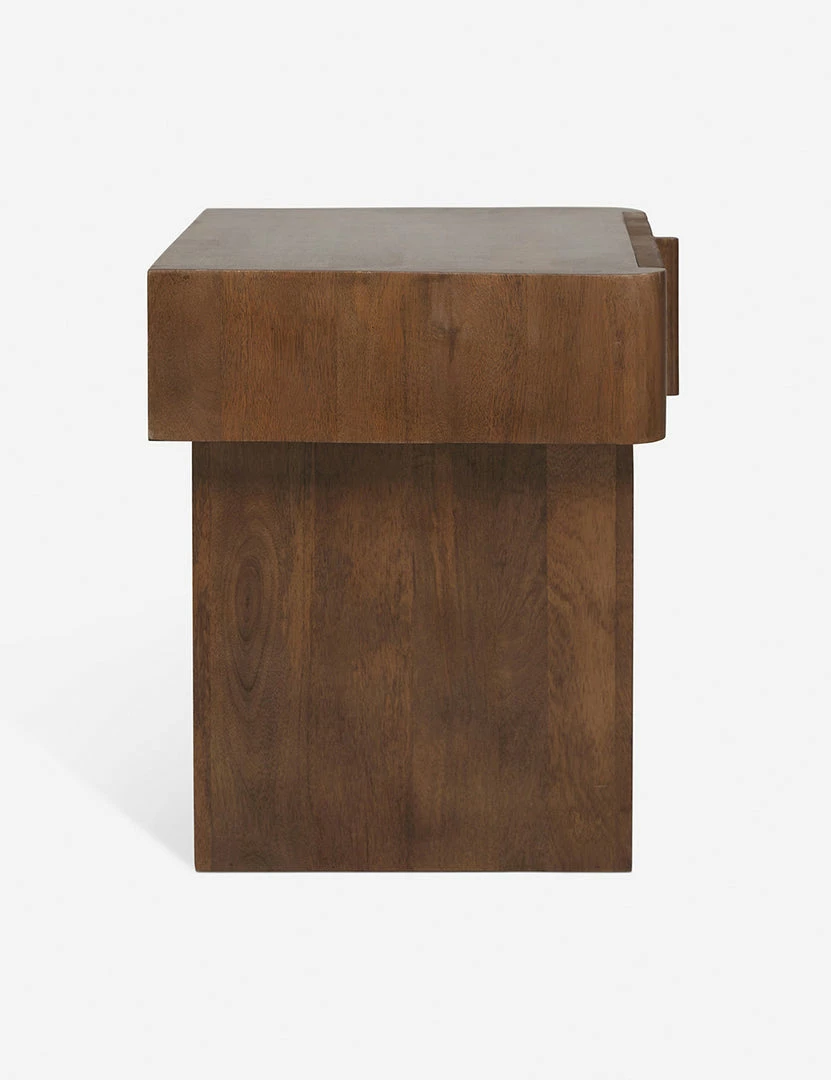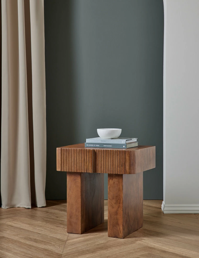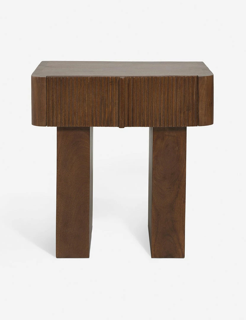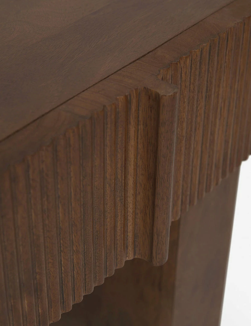 The Merrit nightstand features a deco-inspired woodwork construction that pairs crisp, curving lines with ridged detailing and a carved drawer pull. A a convenient drawer provides helpful storage for this bedside table in a darker finish. This piece is from our exclusive Sarah Sherman Samuel collaboration and features all the trademarks of her warm, edited style.