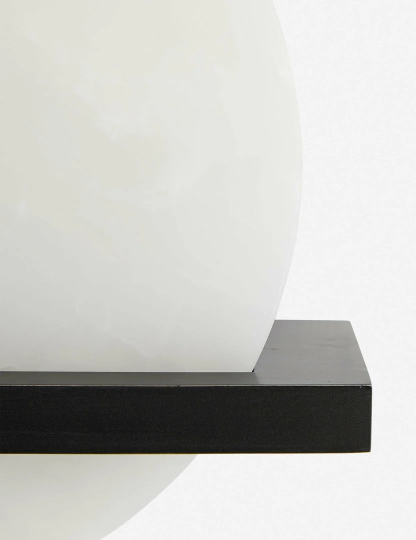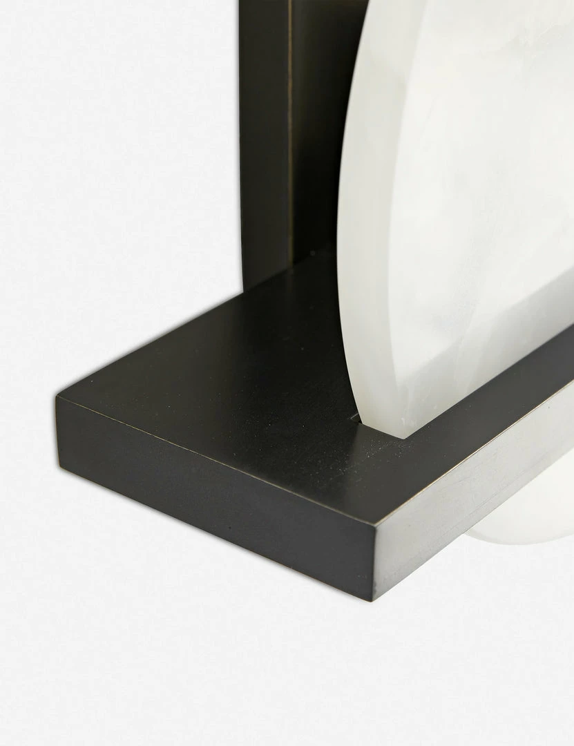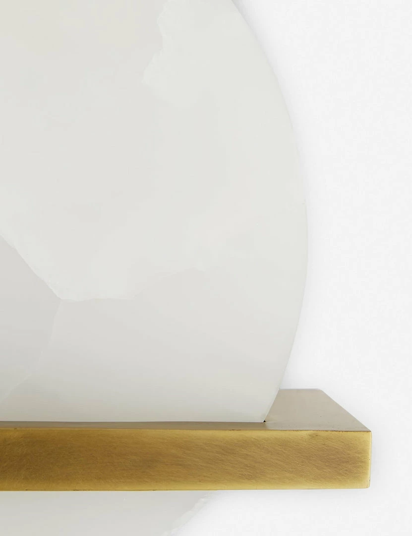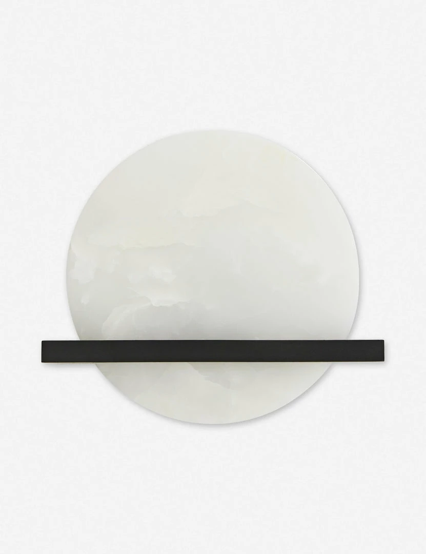 A modern indoor wall light fixture that brings a soft glow to any room, this wall sconce features a circle of white onyx stone resting in a sleek metal frame. As light diffuses through, you can see the delicate veining of the stone, adding subtle texture to the look.