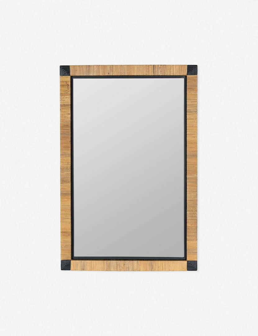 An eye-catching design strikes a balance of texture and tone in this decorative wall mirror. The rattan frame offers natural warmth while black corner accents create a touch of contrast. Style this mirror for a casually refined look in your entryway or living space.