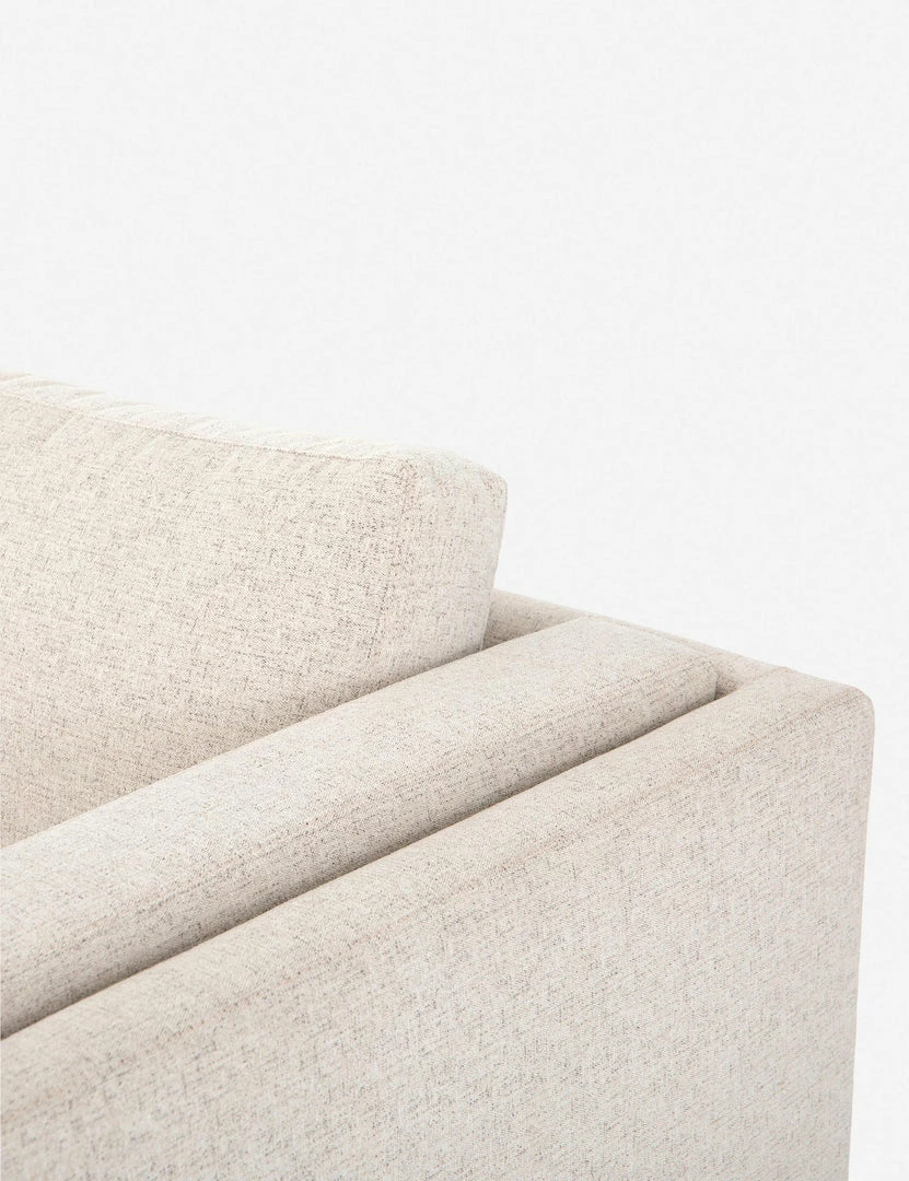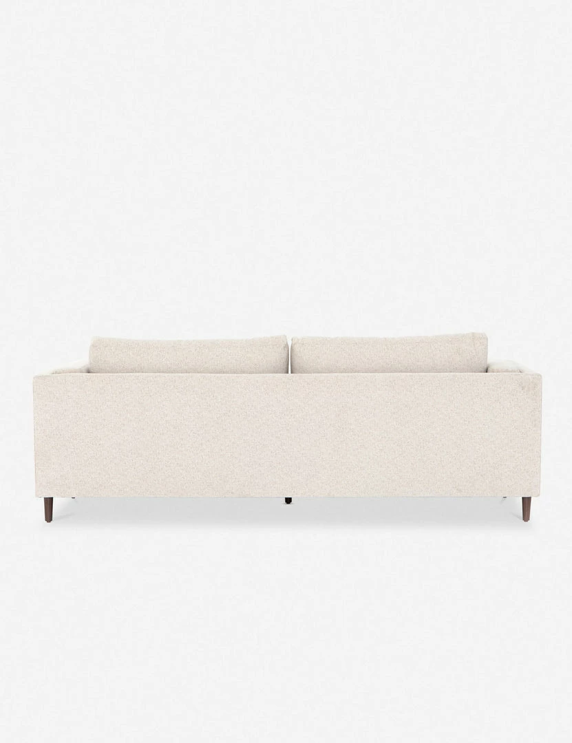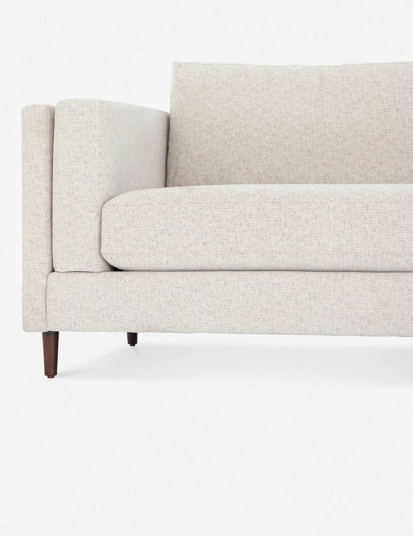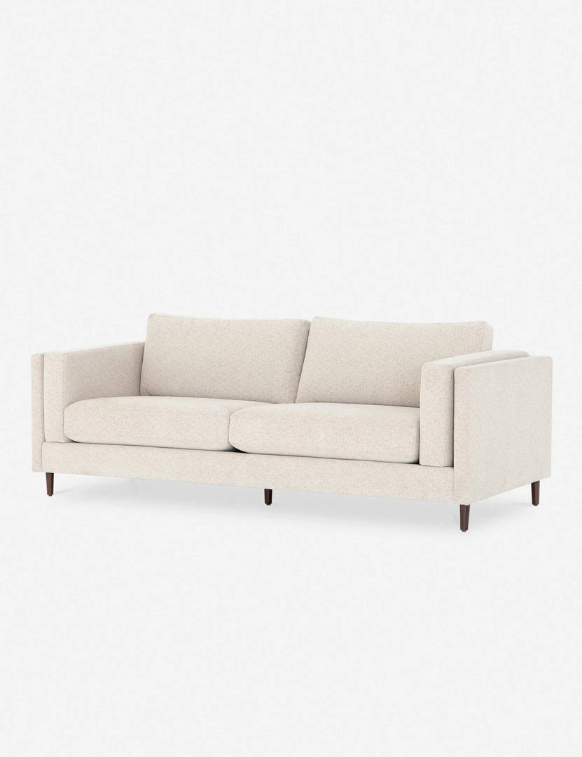 Clean, layered lines inspire a delicate elegance in this dynamic sofa. The tapered, auburn-finished legs offer an airy elevating touch that complements the light-toned, performance-fabric upholstery for a visually light profile that belies a spaciously substantial living room couch.