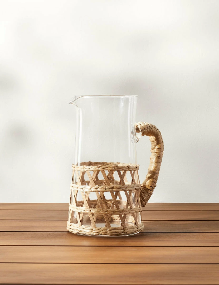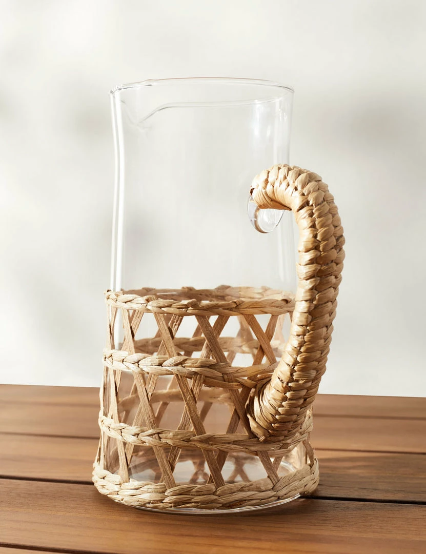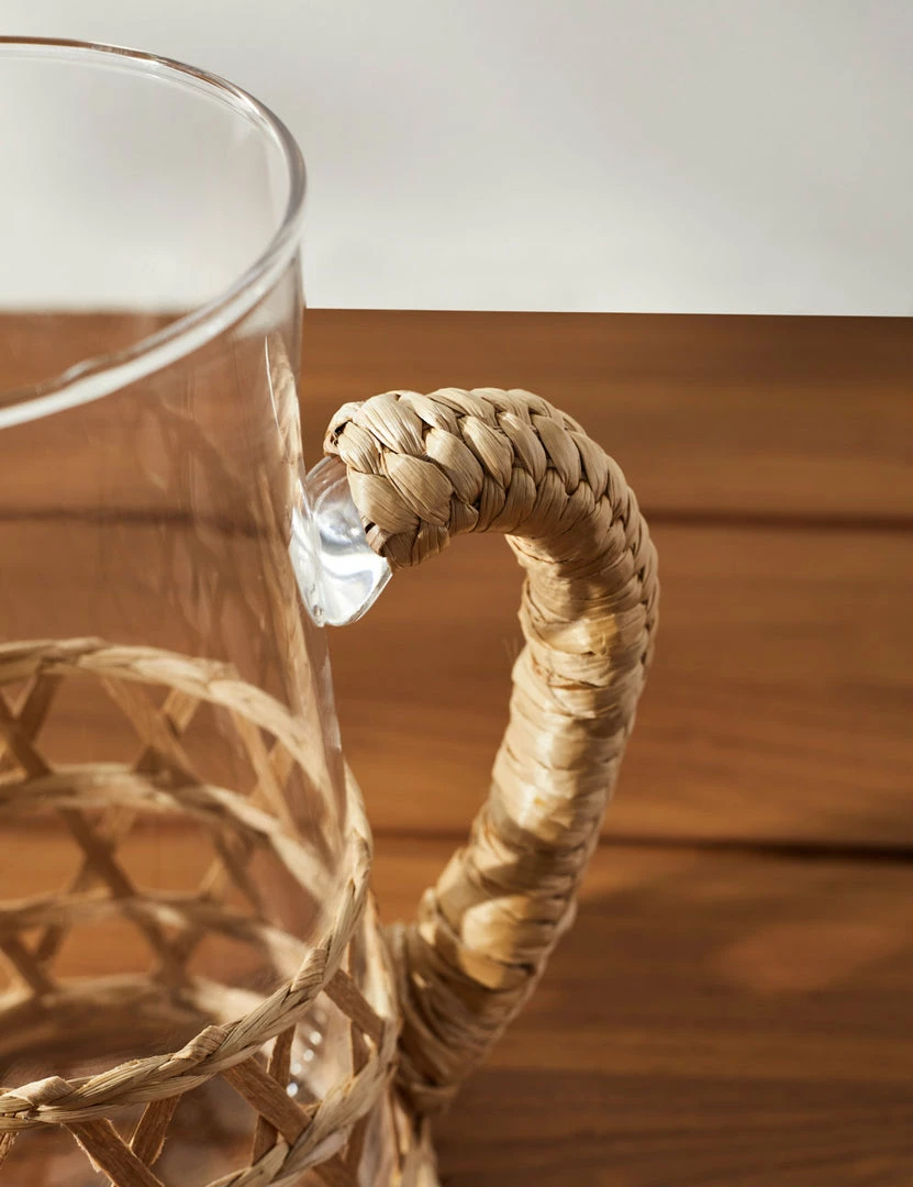Set a place for organic style at your table with this glass pitcher featuring a natural seagrass accent. With an open weave and wrapped handle, the textures perfectly complement a tall glass of fresh-squeezed juice or a tropical cocktail. Pair with our other Shelly glassware for a matching set or style as a unique addition to your barware collection.