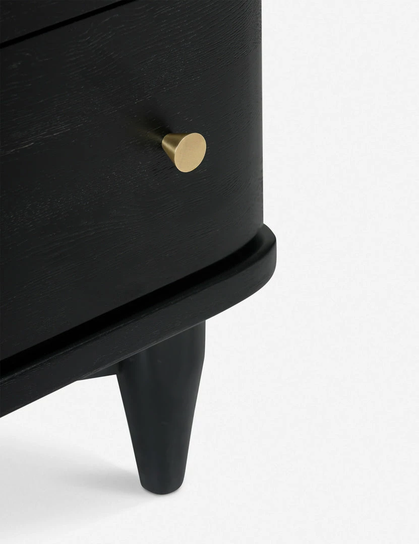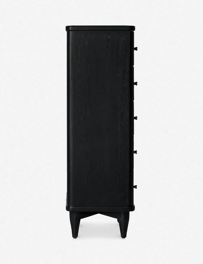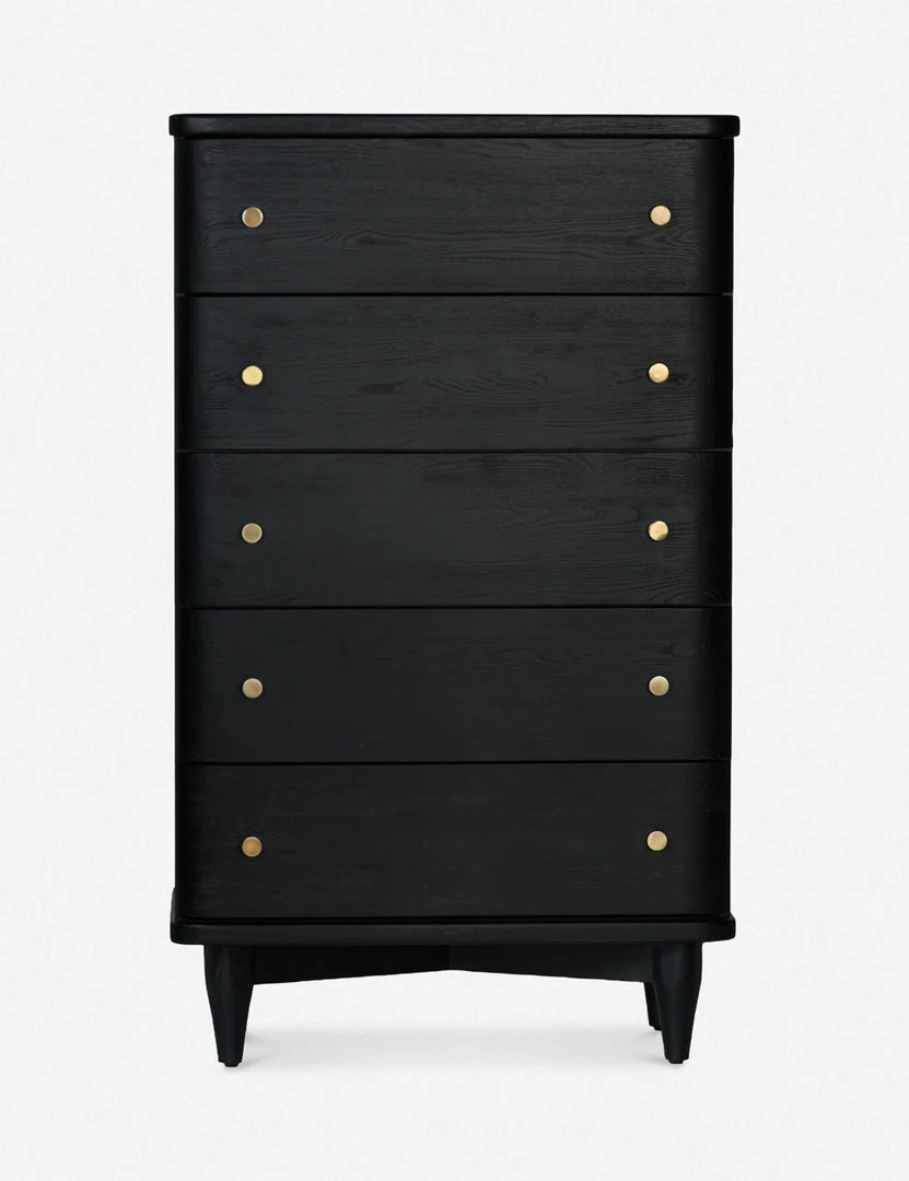The soft, sculpted lines of this FSC-certified oak dresser complement its natural wood grain texture. Set on tapered legs, this tall dresser features five spacious drawers in a compact footprintβand its metal pulls offer a distinctive touch. Style it with a vase and fresh greenery.